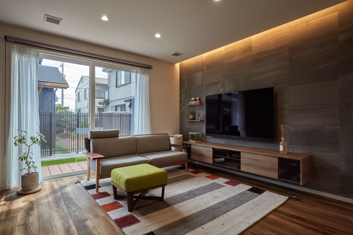 リビングの窓越しに見えるウッドデッキは色味を室内の床と同系色で揃えれば、床続きの同じ空間としてLDKをより開放的に見せることができるね。