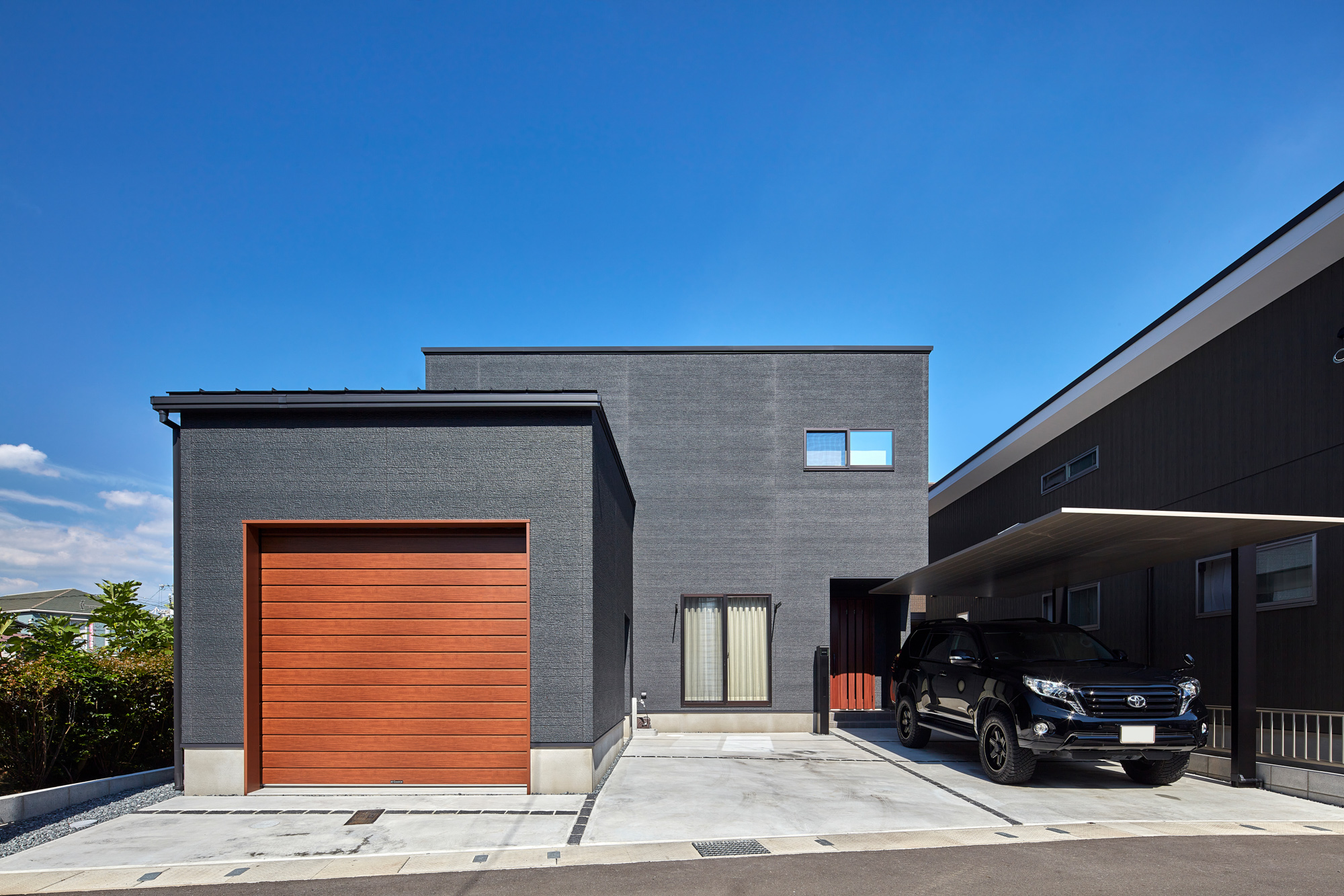 ブラック一色の外壁に赤みの強い木目でシャッターと玄関ドアでアクセントに。