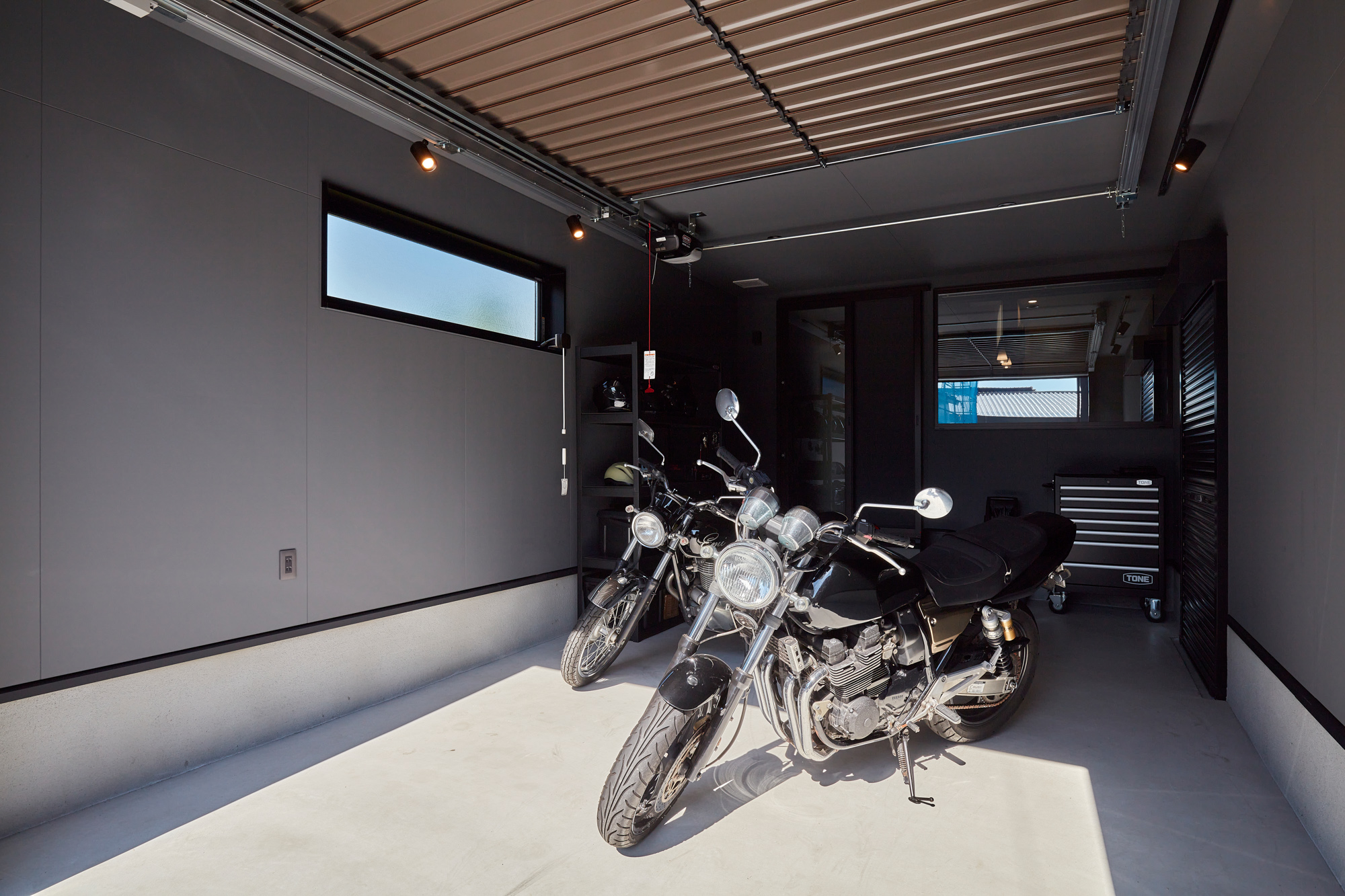 バイクを出し入れする際、ひとが出入りする際には正面の大きなシャッターではなくコンパクトな開口のシャッターを設けることで時短に。