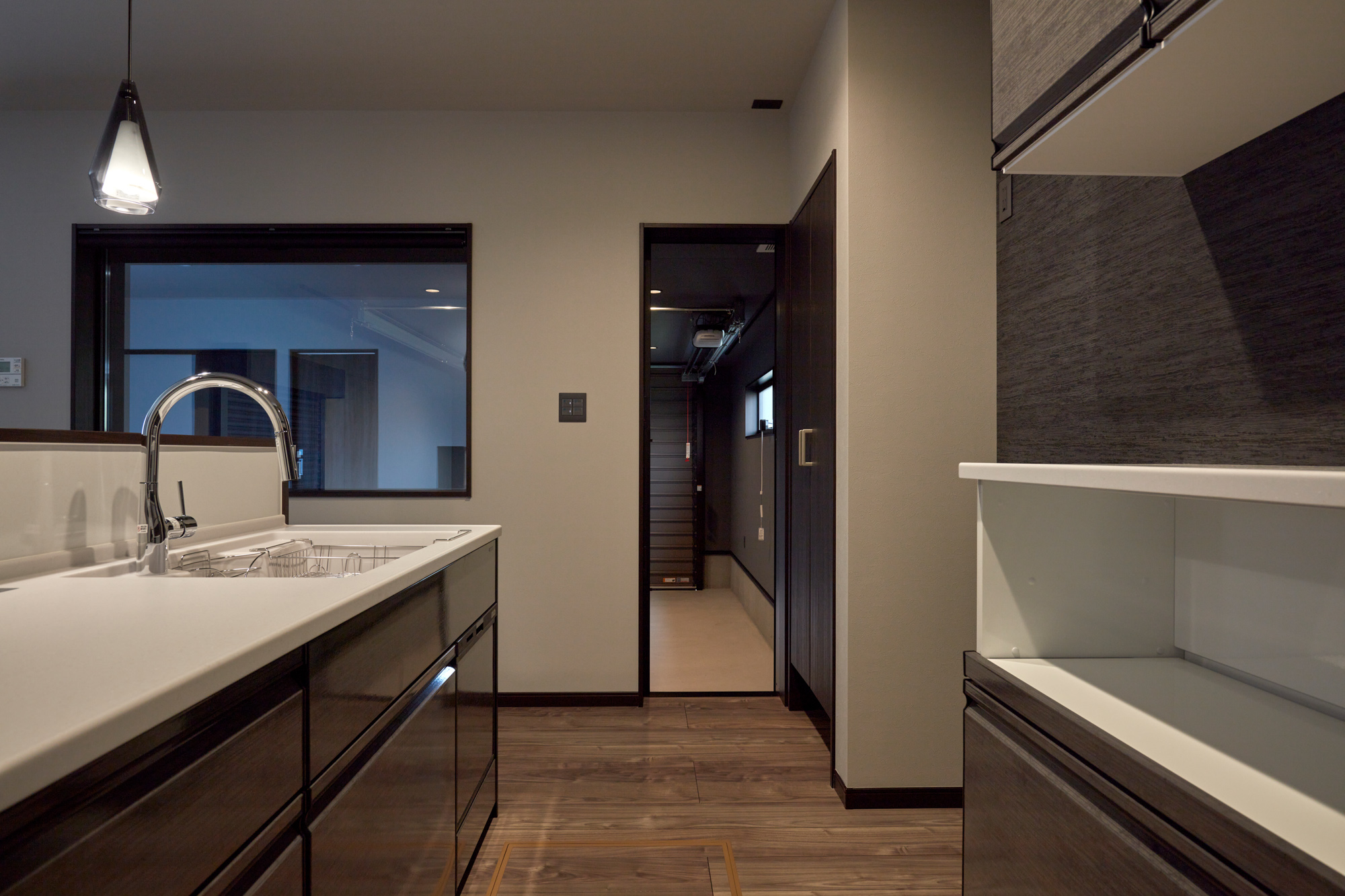 車から荷物をそのまま出し入れでき、更には室内からガレージを眺めることができる大きなFix窓を配置。