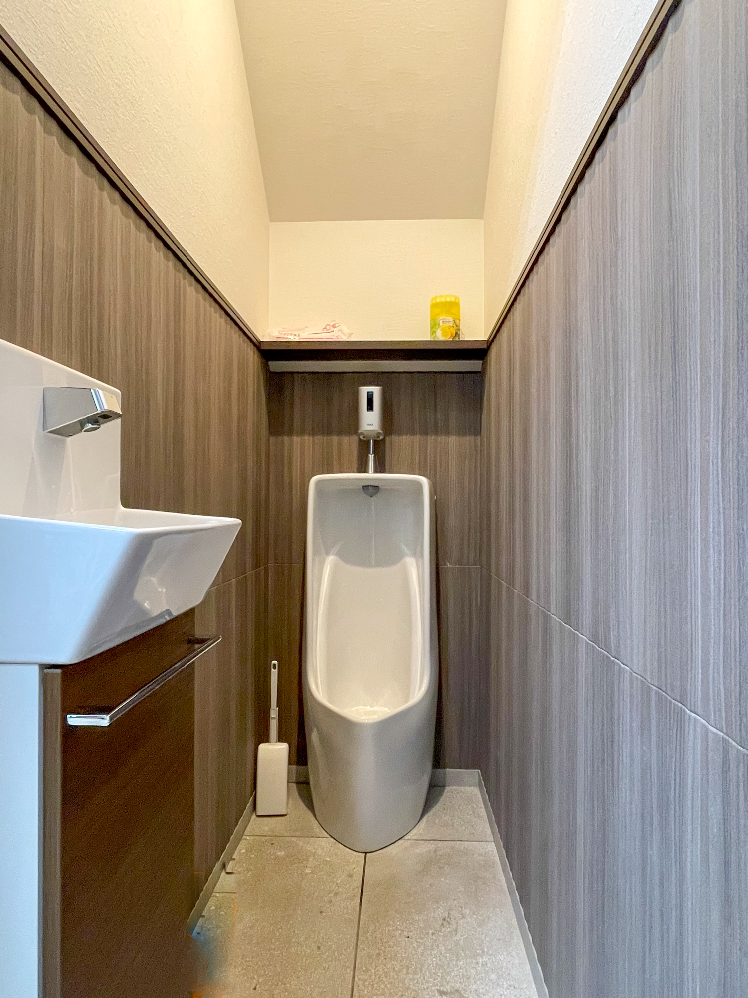 社員用のトイレは、男子トイレを男性的な落ち着いた雰囲気、男女兼用のトイレを女性的な可愛らしい雰囲気にしました!