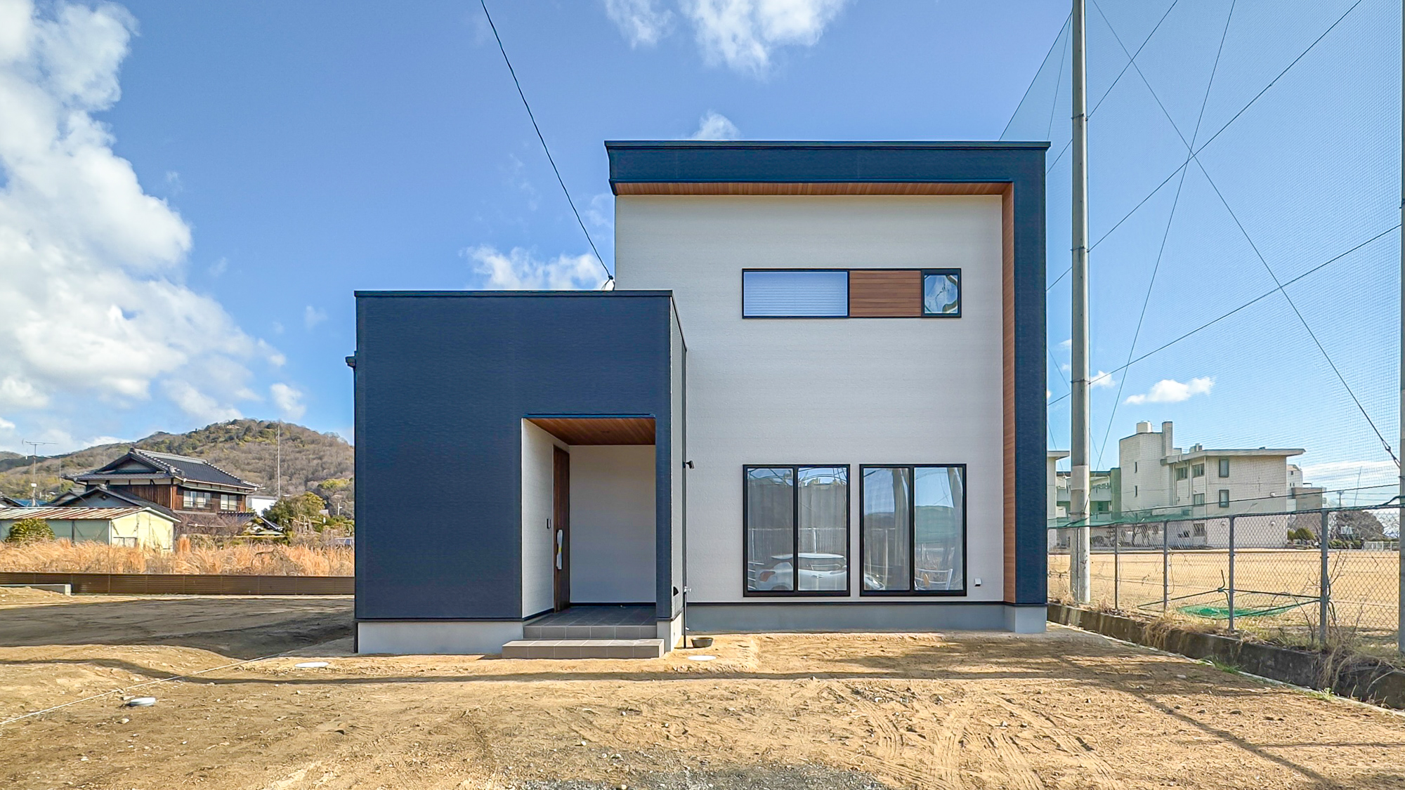 ネイビー×木目×ホワイトでおしゃれな3色使いの外観です。