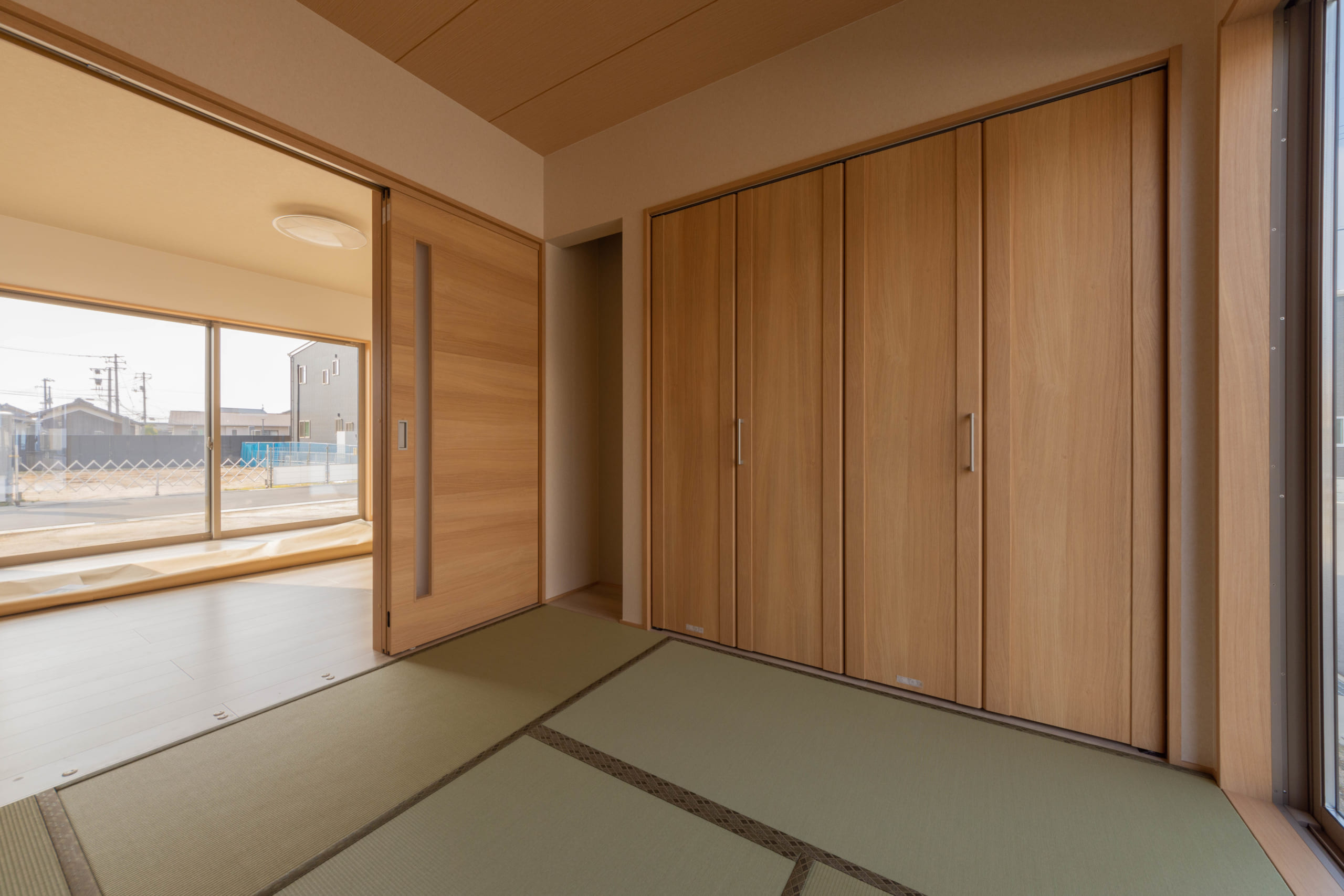 流行りの平屋で、和室には一帖畳を使っており、まとまった平屋の間取りの中にもお客様の落ち着いた暮らしをしたいという思いが詰まった設計になっています。