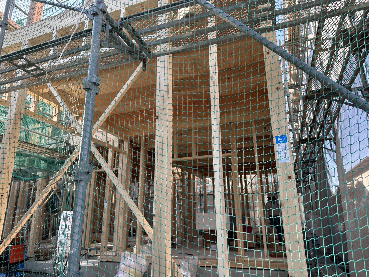 1階の柱が建ち、2階の床、屋根へと進んでいき立体になるにつれ迫力も出てきました?(*^。^*)