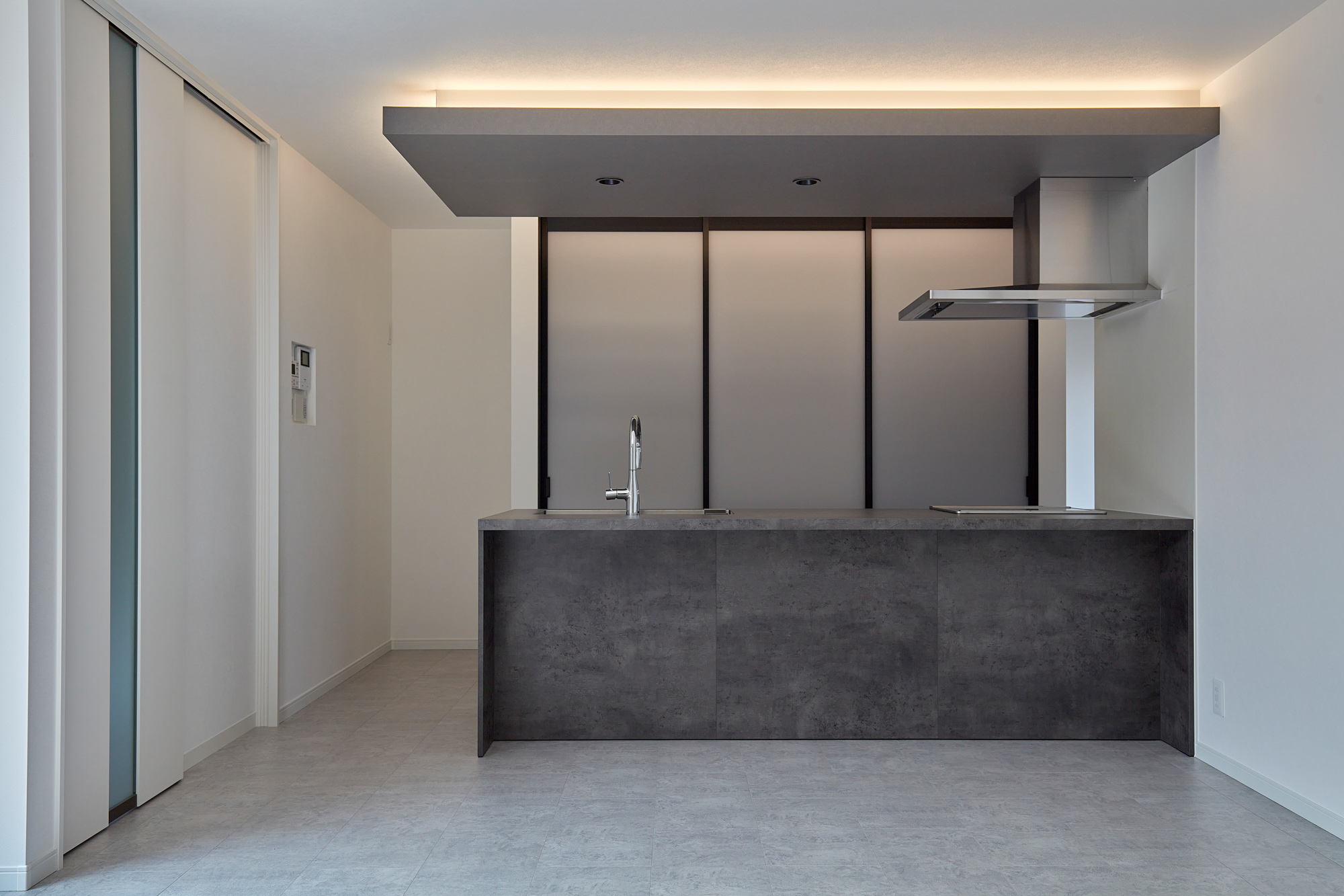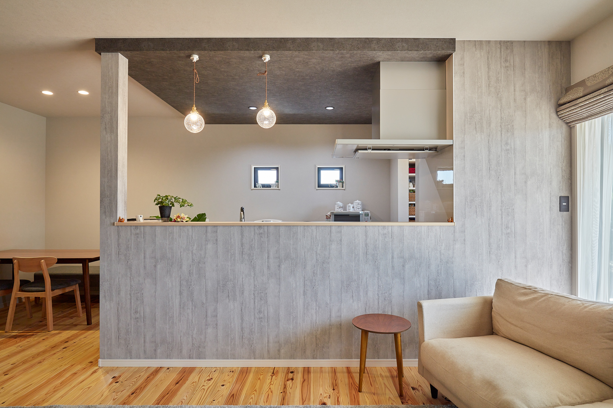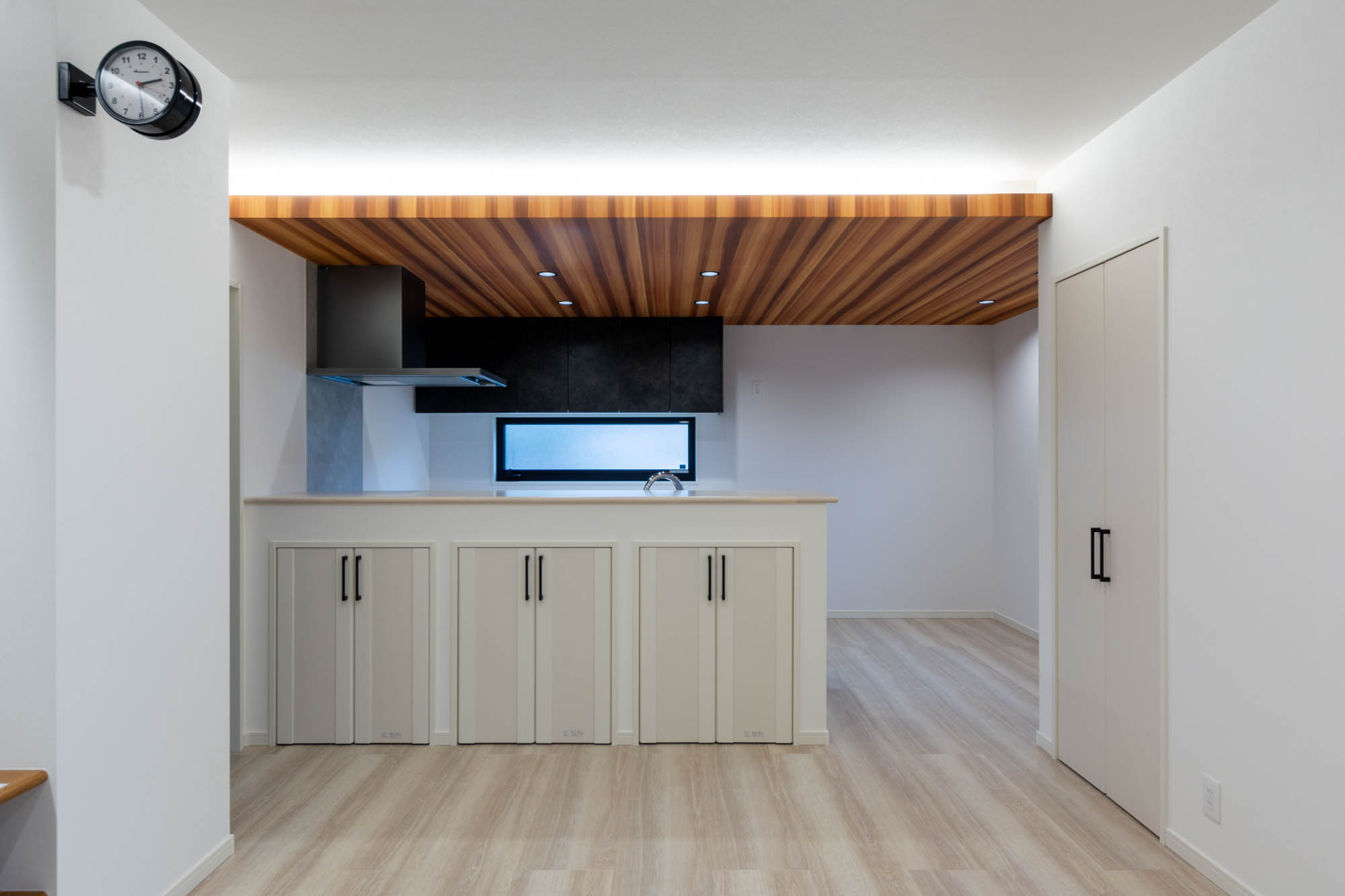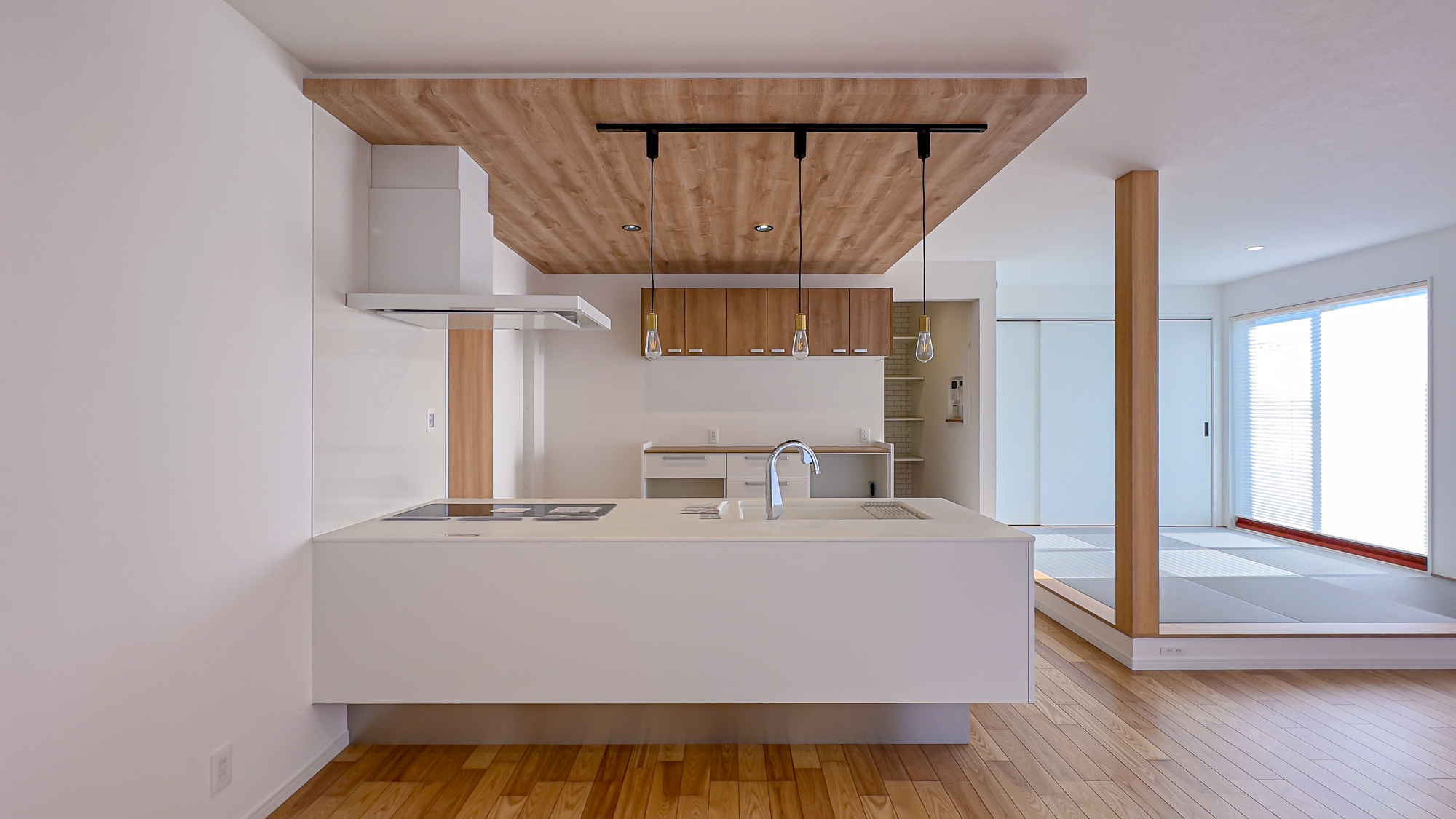 キッチン上で採用する理由としてはキッチンとダイニング、リビングの空間を分けたい為や天井の段差を利用してクロスを貼り分ける為。
