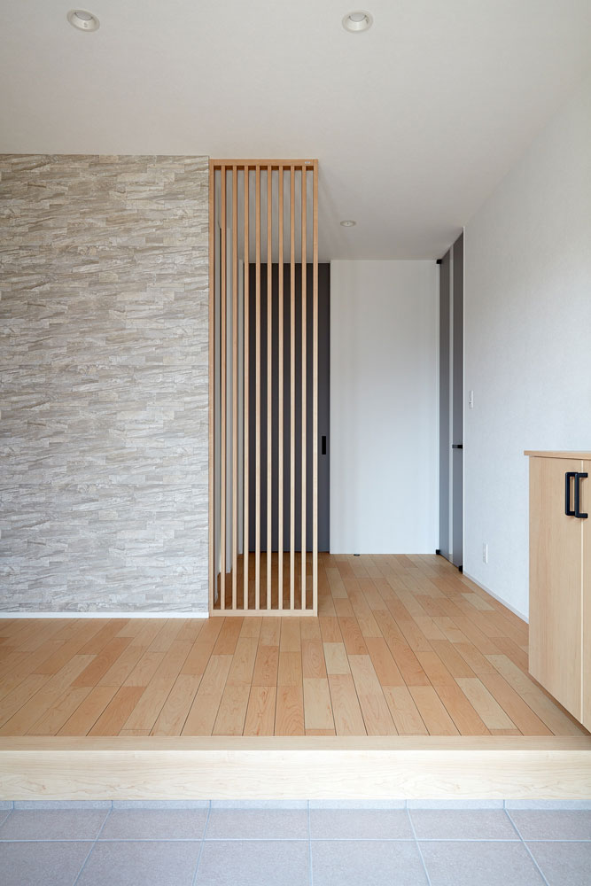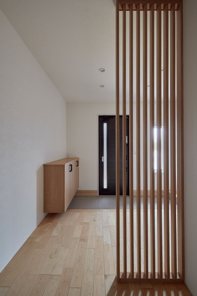 格子の隙間からは、向こうの空間が見え、玄関ホールが広く感じることができます。