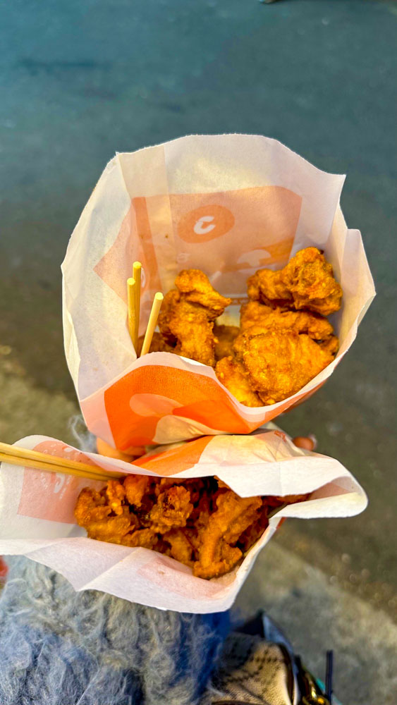 ここで、初めて台湾で口にしたものは、チキンとタコのから揚げ、そして、にゅう麺!?