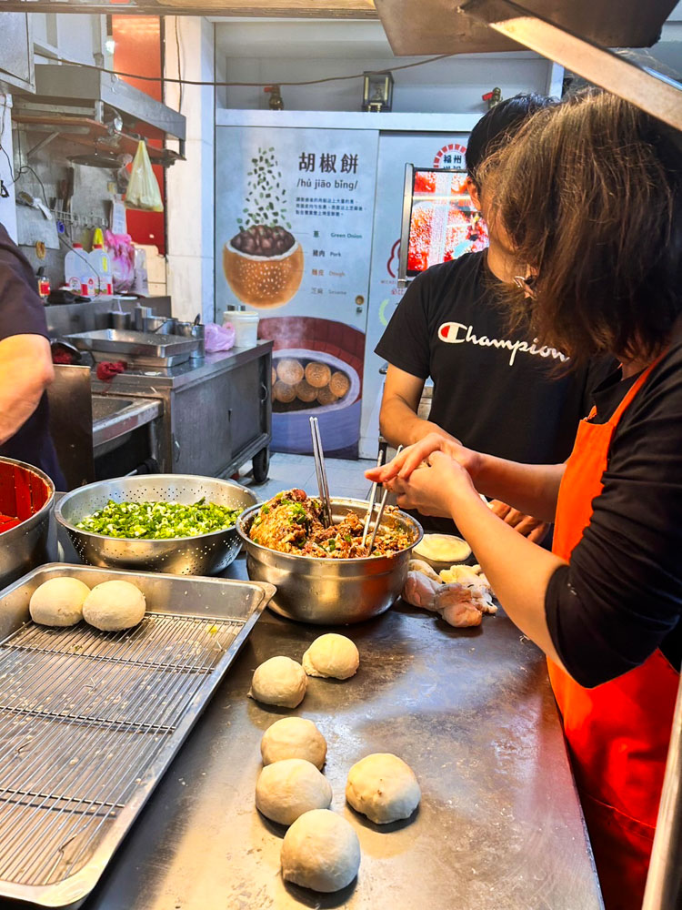 ※胡椒餅(釜に張り付けて焼いていました。表面がカリカリで香ばしくネギたっぷりのスパイシーな肉まんみたい。)