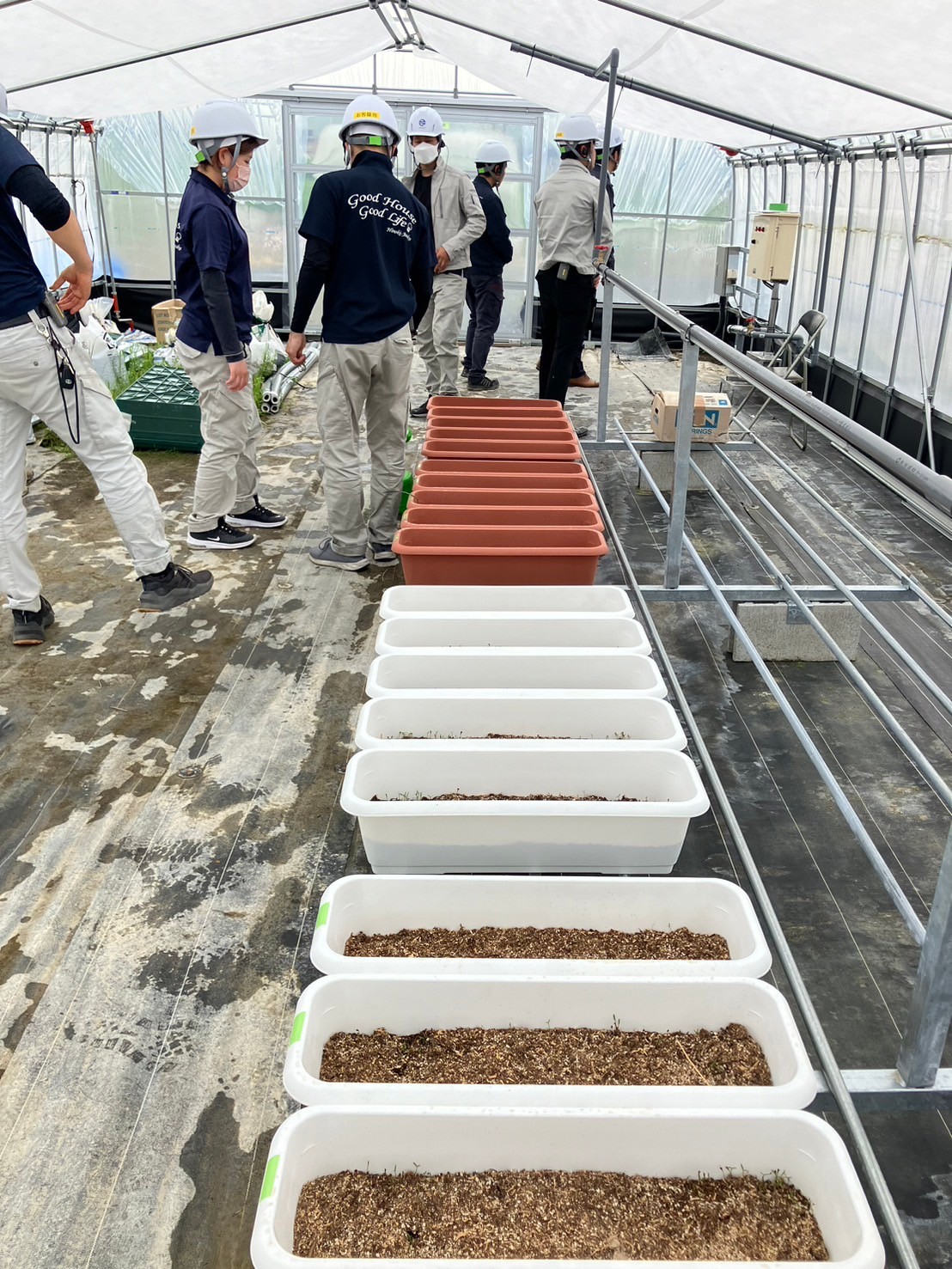 最後にビニールハウスで苗になる前の、ひのきの種を埋めています。