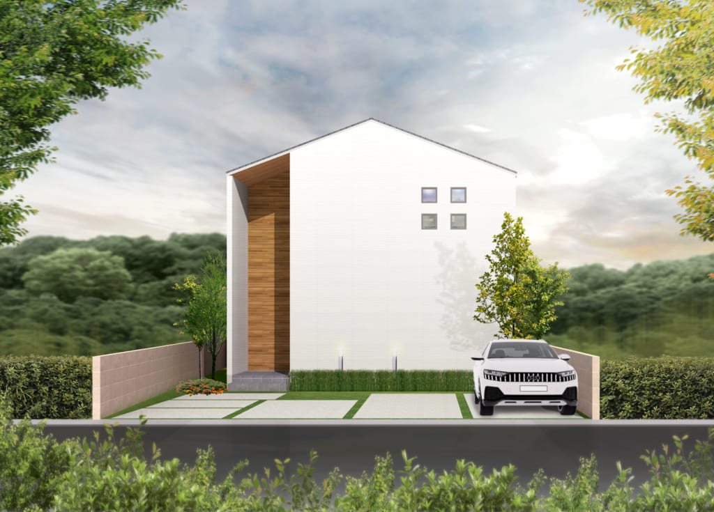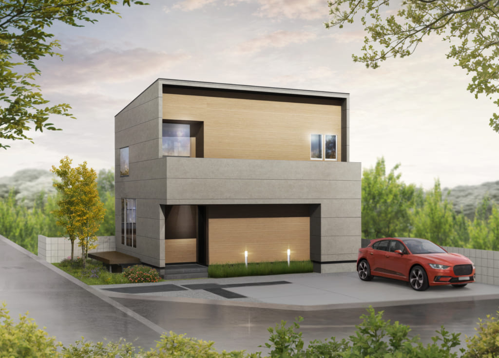 外観はスタイリッシュで目を引くモデルハウスになっています。