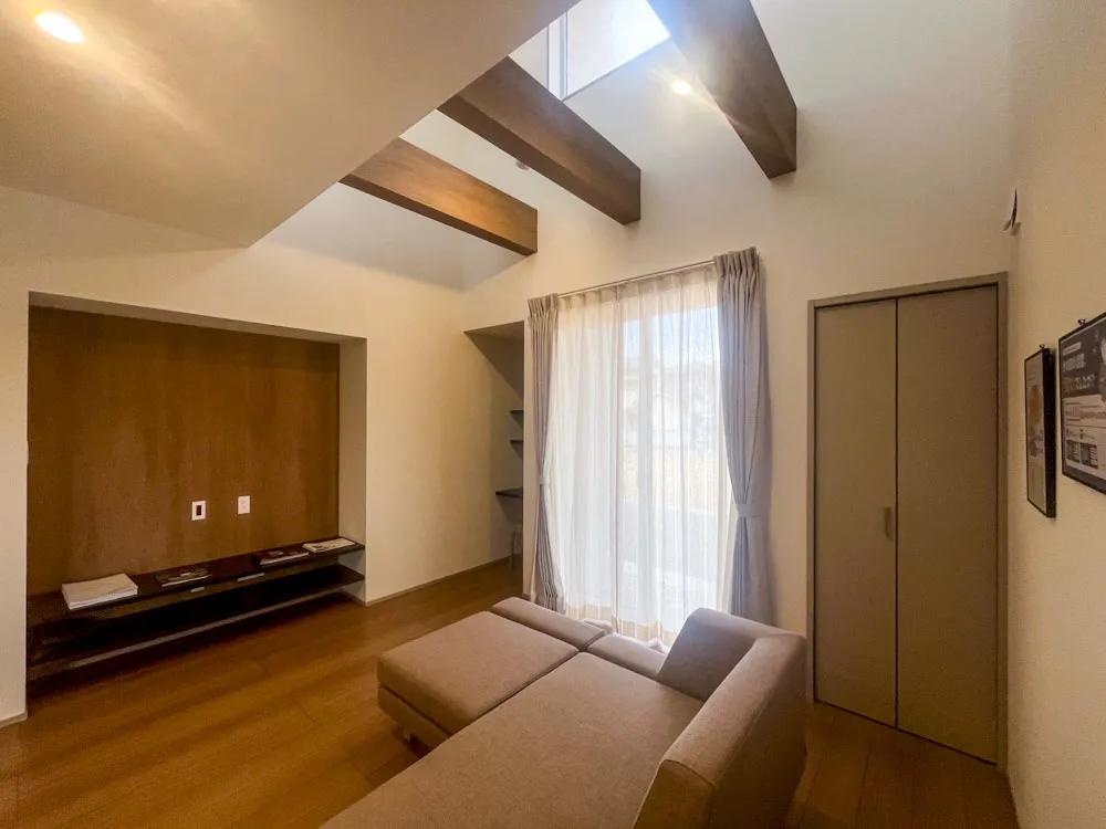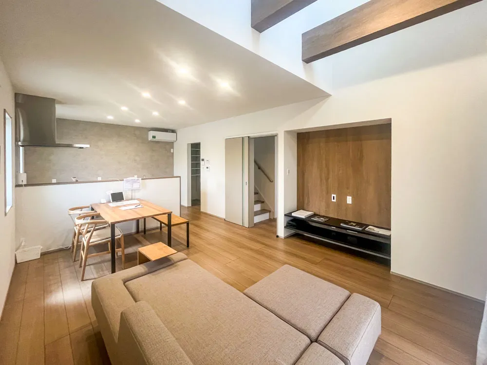 外観はベージュ。内観は白を基調とした落ち着いた雰囲気となっており、リビングに一部吹き抜けを設けることで、自然光がしっかりと差し込みます。