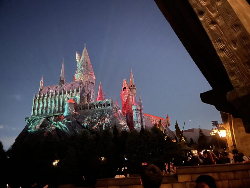 ハリーポッターエリアのホグワーツ城は夜にプロジェクションマッピングもされて圧巻の景色でした。