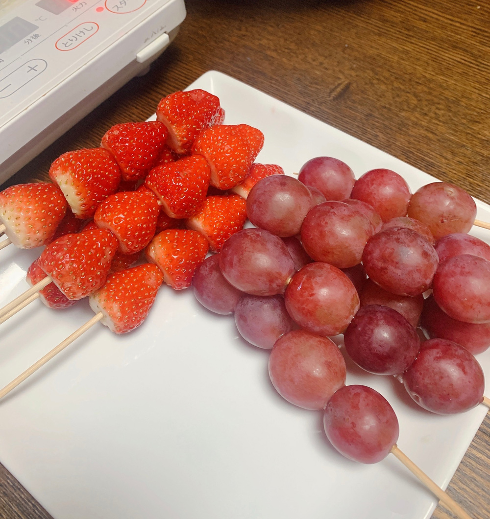 砂糖と水を火にかけて混ざり合う間に、いちごとブドウを串に刺す作業。