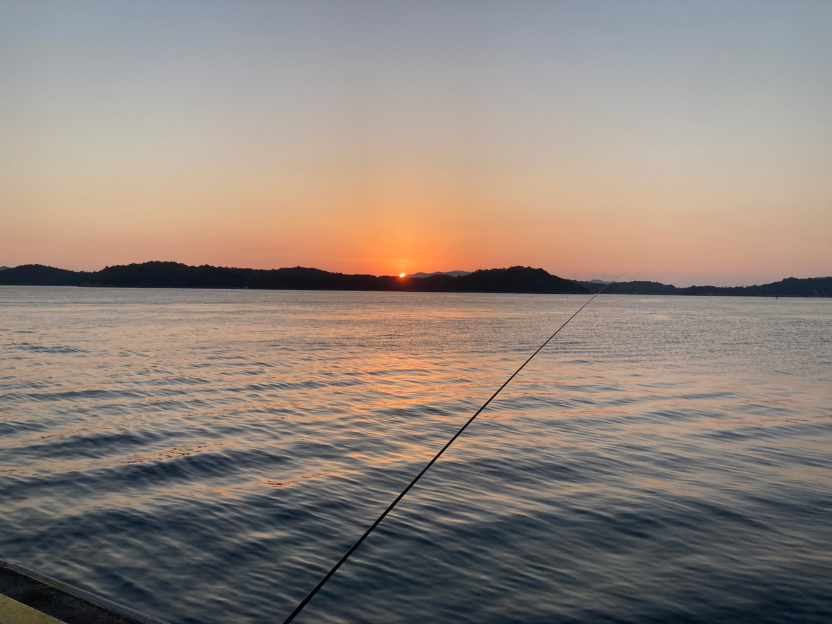 午前6時。一番乗りです。撒き餌で沖から近くまで寄せて釣るので手返しの早い延べ竿(7.1m)で釣ります。朝日が綺麗です。