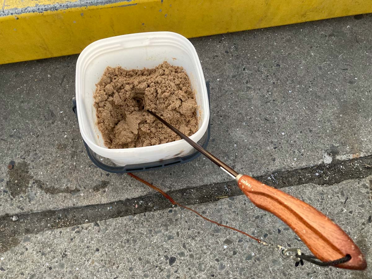 撒き餌製作。アミエビを細かく砕いて集魚剤と混ぜ、かさ増しに米ぬかを入れ海水を入れ練り込みます。練り込み固さにはこだわりがあります。