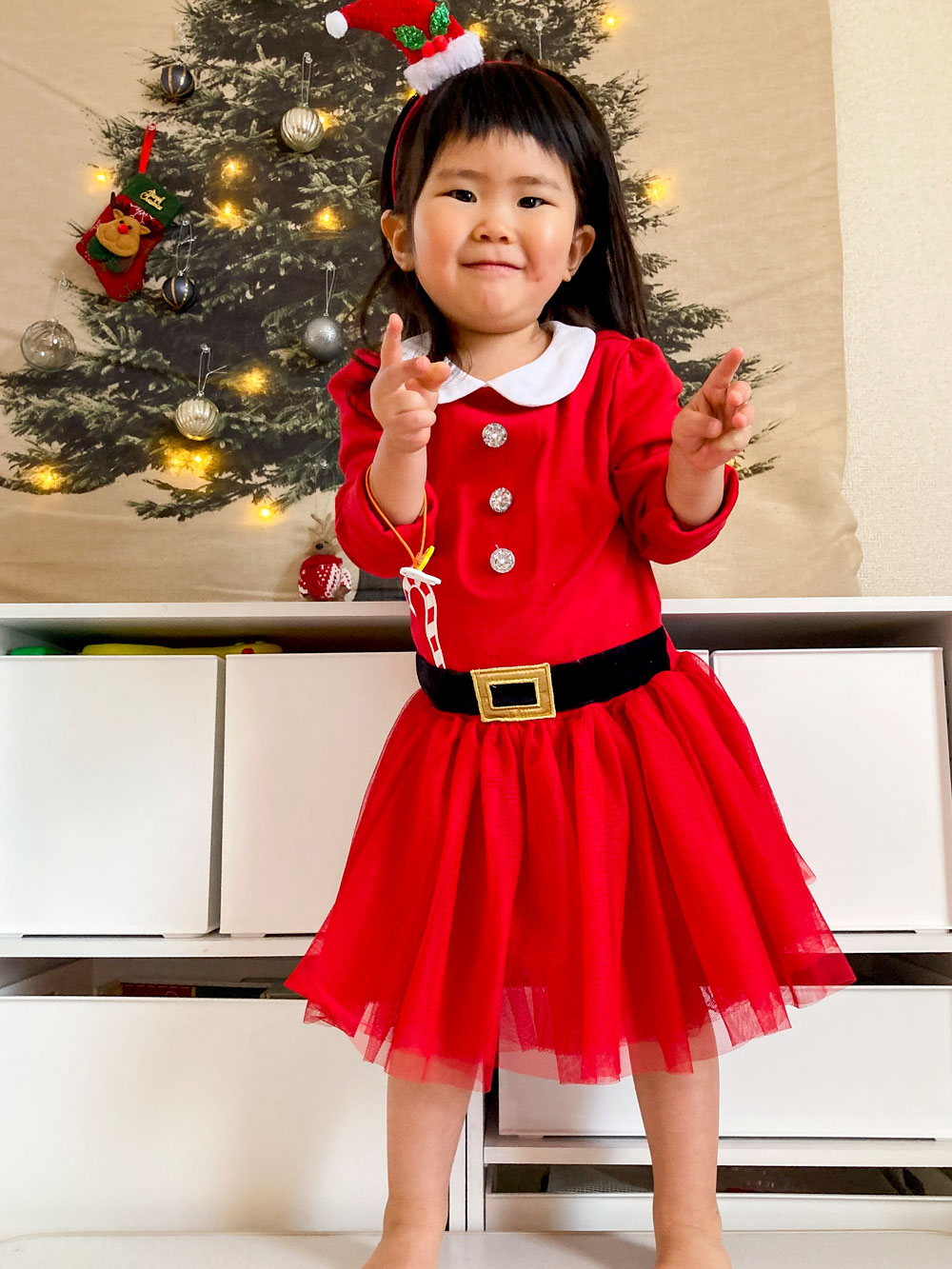 クリスマス カラーに街が色づき始める中、我が家のアイドルも一足先にサンタ化 笑