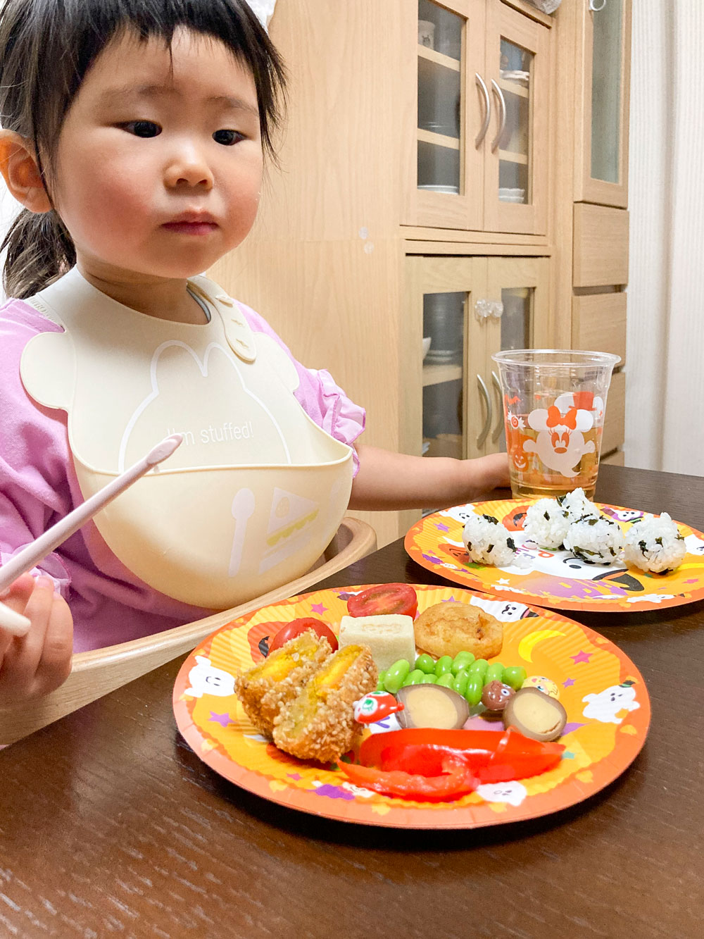 夕食のお皿もハロウィン仕様 いつもより少しご飯の量も多く食べてくれた気がしました??ようやく首が座りつつある息子も顔を傾け賑やかな装飾を見て楽しそうに笑うのでした。