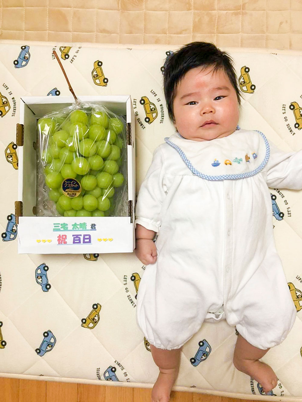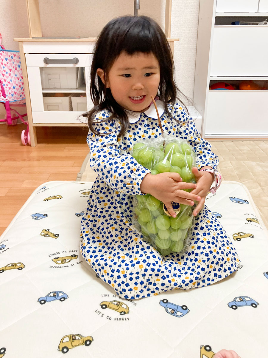 初参りの帰り、久美ちゃんのお父さんが太晴くんに特大シャインマスカットをプレゼントしてくれました。