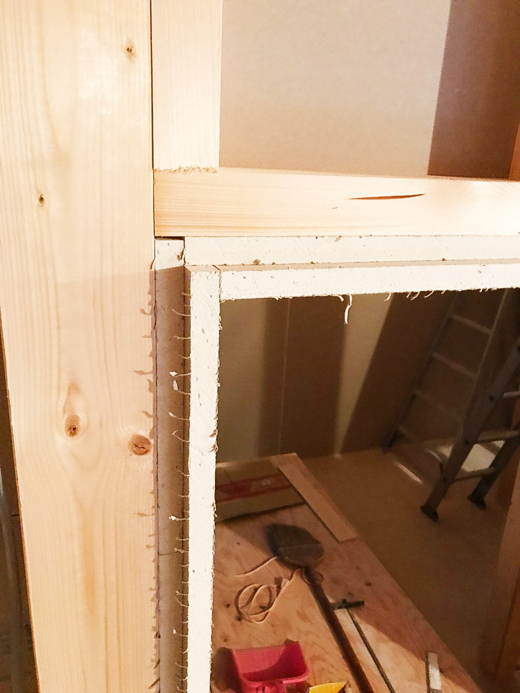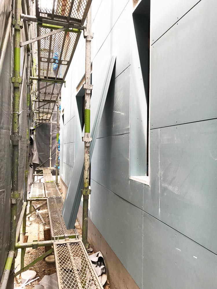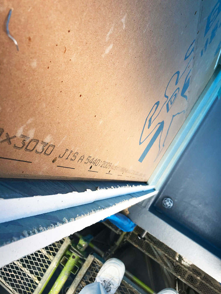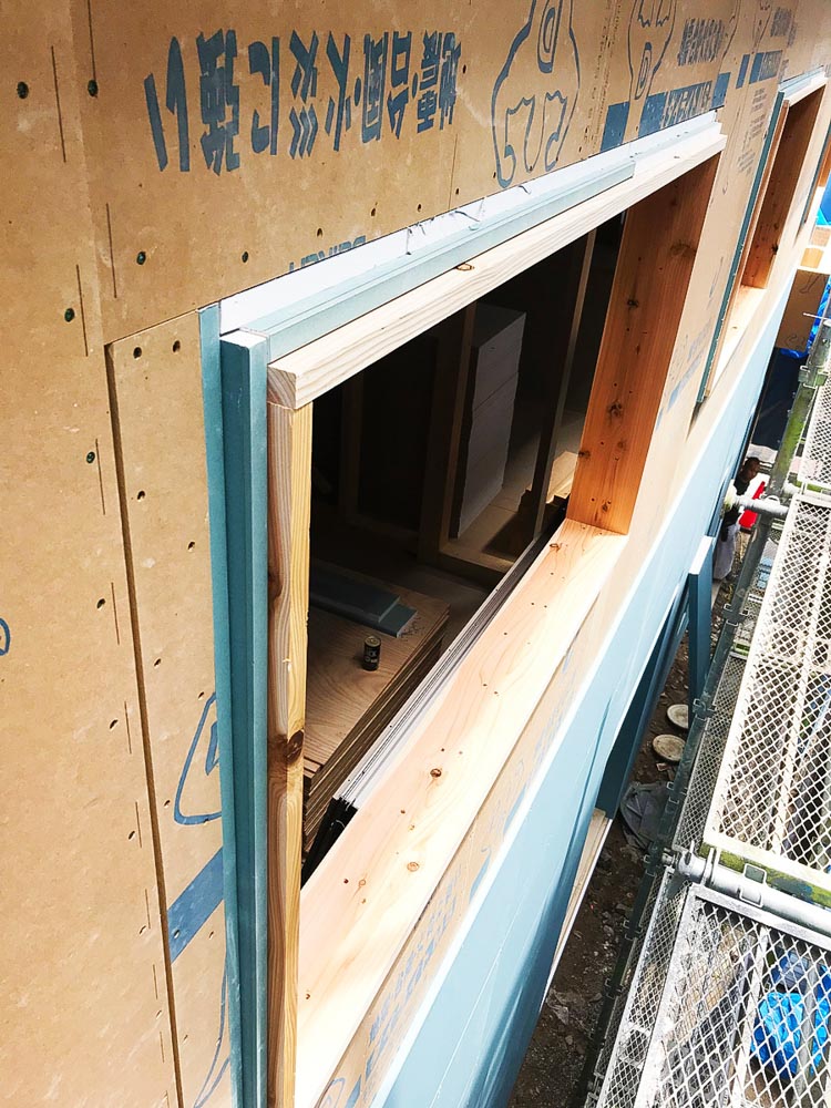 工務の平田です。 今回は防火地域のボード施工を一部紹介します。 内側も外側もボードを二重に張ってます。 サッシ周り等も全てボードを施工し防火をとってます。 防火地域に施工するのは普通の住宅とはかなり仕様も制限されます。