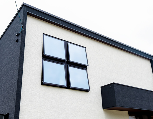 4枚の窓ガラスがシャープでカッコイイ! 天気が良いと青空が写り込んで更にシックな感じに!