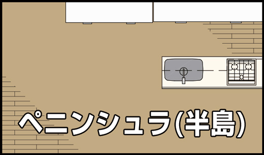 半島型キッチンとも呼ばれ、アイランドキッチンよりもコンパクトで