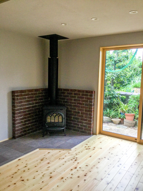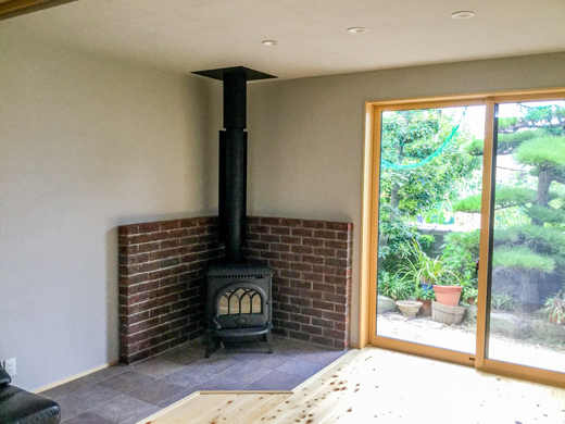 薪ストーブの置かれている床はタイル貼りにし、