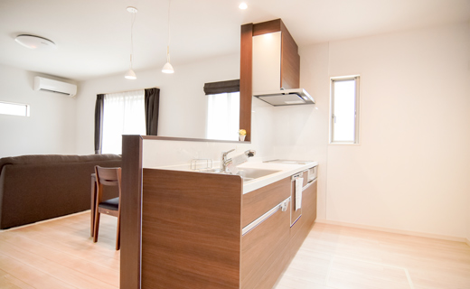 家事動線の良い、洗面・お風呂場と隣接したキッチンスペースは、
