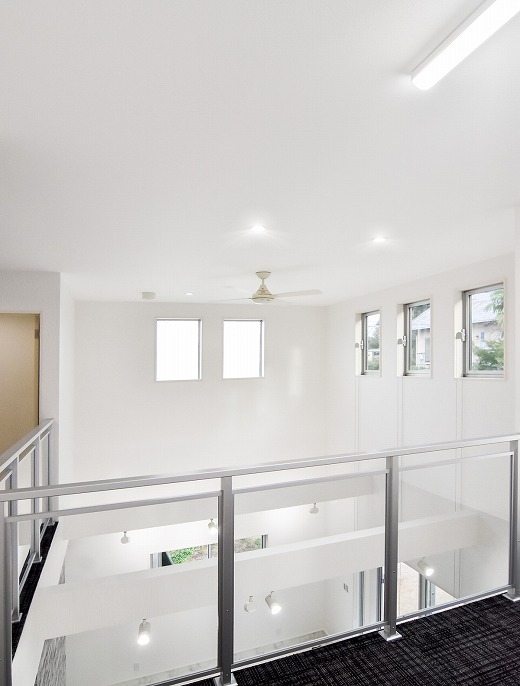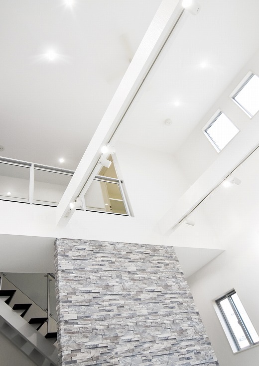 1Fと2Fが吹き抜けになったスペースに、アクセントクロスがマッチした