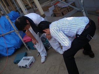 上棟日の打ち合わせは力が入ります(大室部長&HIO)