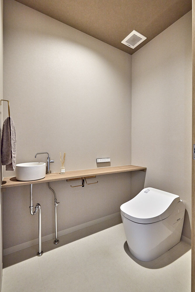 シンプルではありますが、グレージュの空間とホワイトのトイレの対比で綺麗です。僕もお施主様も一番のお気に入りに空間になりました。