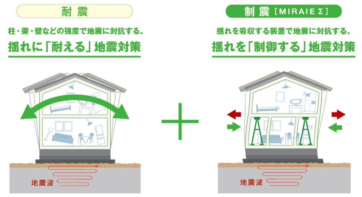 住宅用制震ユニット『ミライエ』は、住まいの持つ耐震性にプラスして余震にも強い、より安心で安全な住まいづくりを実現するよ!