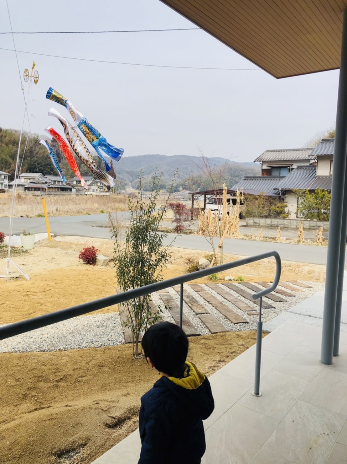 最後は屋根より高い鯉のぼりを物珍しそうに眺める太晴君。(愛)
