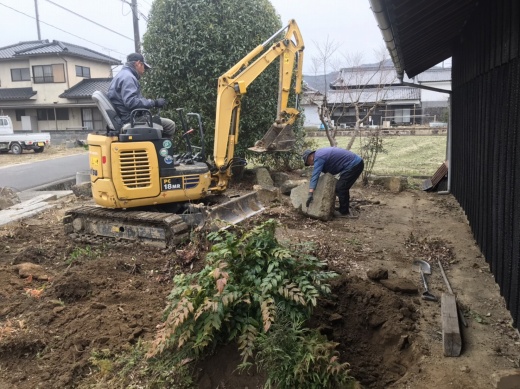 小型の重機をレンタルし、木を切り、石を運び作業しています。