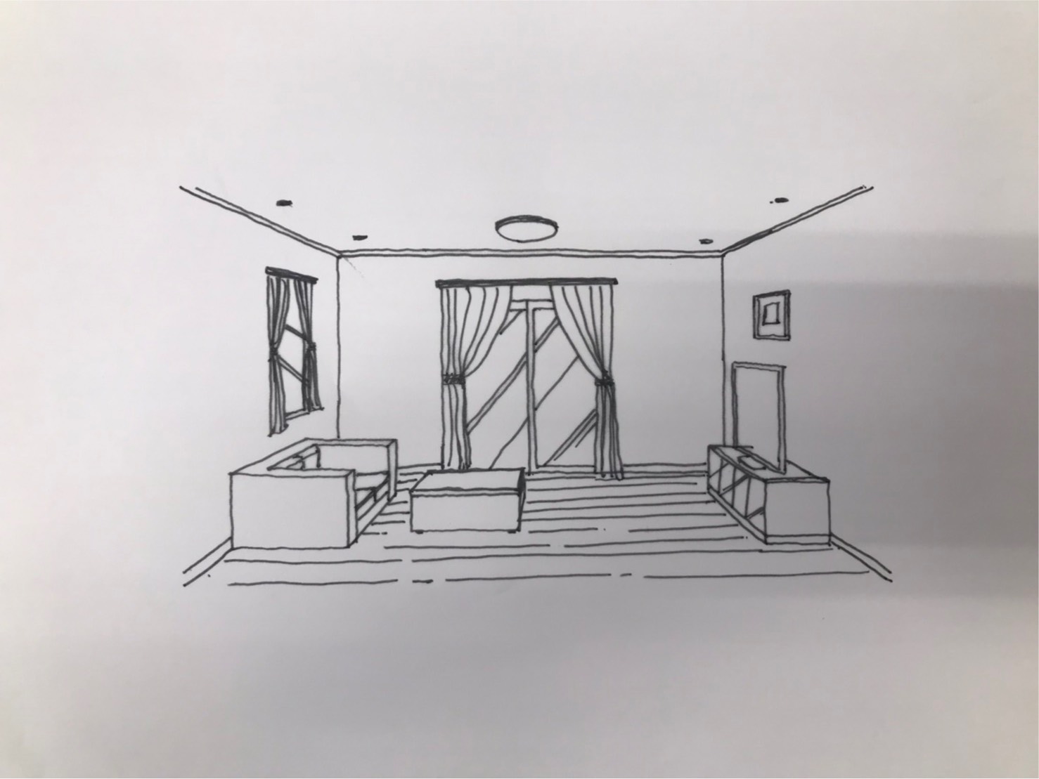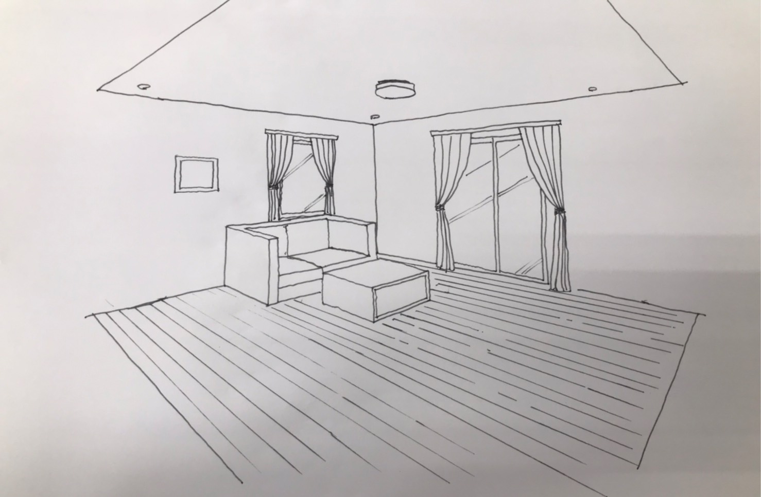 これは1点透視法という技法で描いたもの