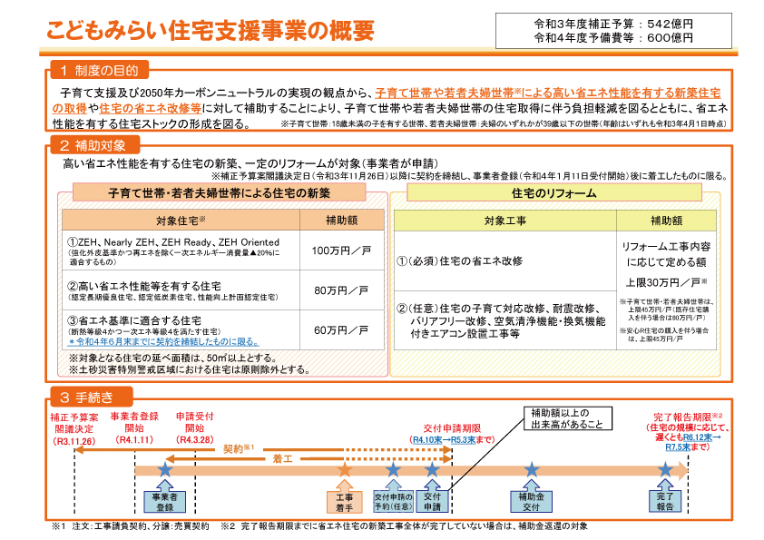 原油価格・物価高騰による住宅価格上昇への対策として子育て世帯等による省エネ住宅購入支援等を継続的に実施する事業です。