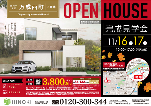~完成見学会のお知らせ~ この度、岡山市北区万成西町に モデルハウスが完成致しました。 11月16日(土)から11月17日(日)の2日間 建売即売会を開催致します。 皆様お誘い合わせの上 是非……
