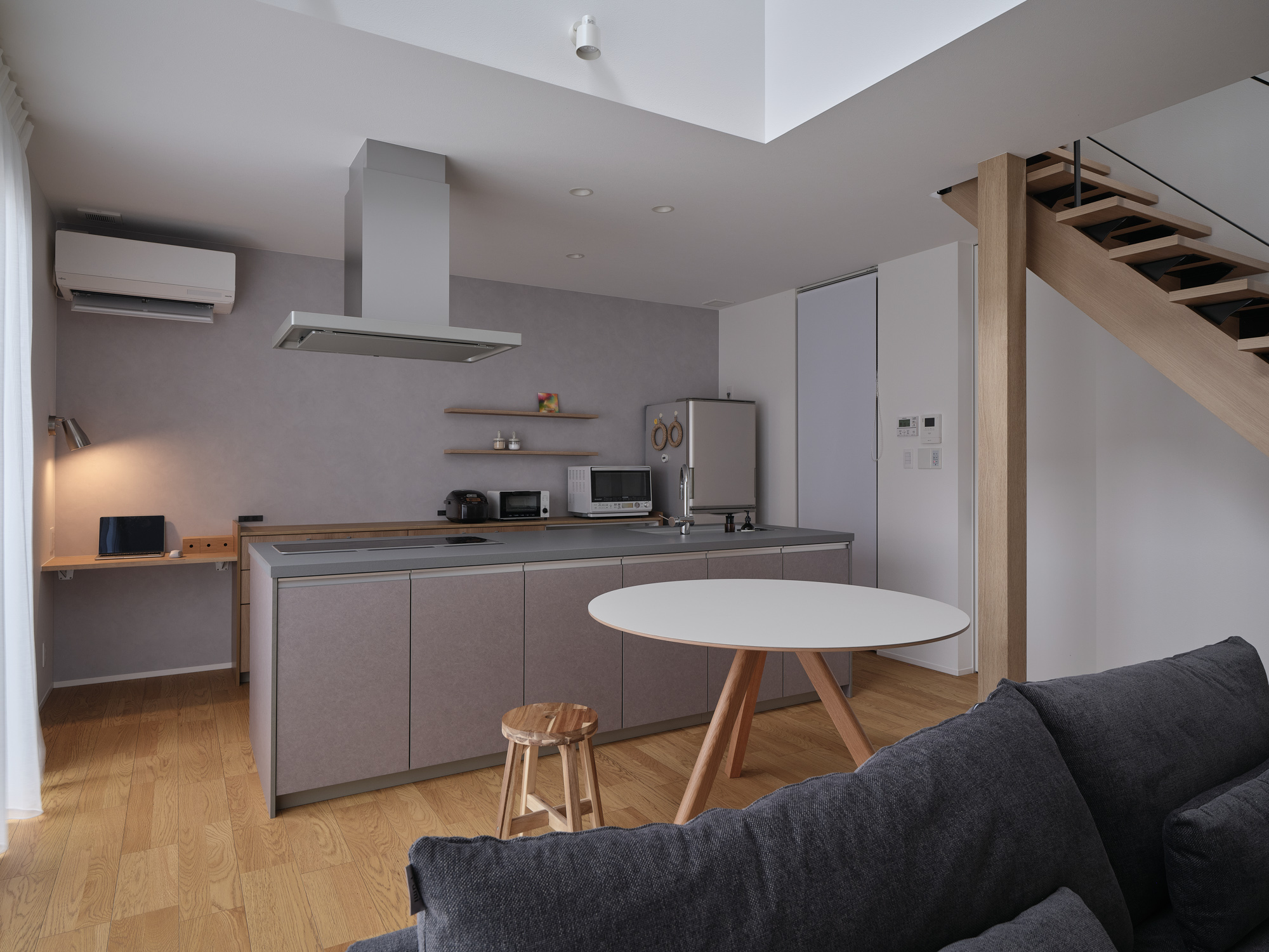 キッチンからリビング、そして吹き抜けへと視線が抜けるため、家事の最中も圧倒的な開放感に包まれます。「作る・食べる・くつろぐ」の境界を緩やかに繋げることで、家族の時間がより豊かに、より密接に重なり合う場を創出しました。