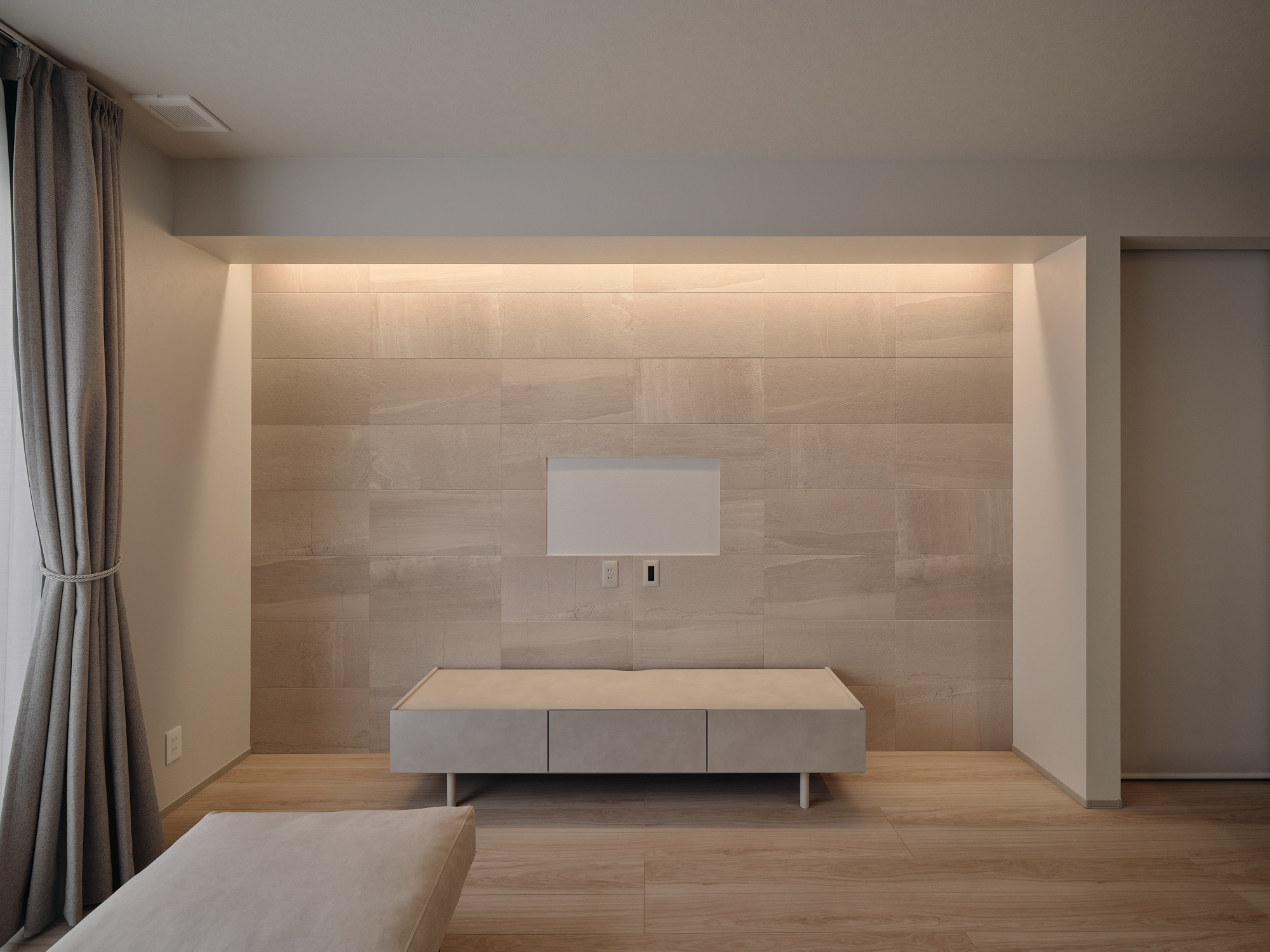 リビングの主役となるテレビ背面には、調湿・脱臭機能に優れた「エコカラット」を贅沢に配しました。ペットと暮らす空間だからこそ、空気の質を整える素材選びは重要です。さらに、壁面に沿って間接照明をレイアウトすることで、タイルの繊細な陰影を強調。夜になると昼間の明るい雰囲気とは一変し、ラグジュアリーなホテルライクな寛ぎを演出する、意匠性と実用性を兼ね備えたポイントです。
