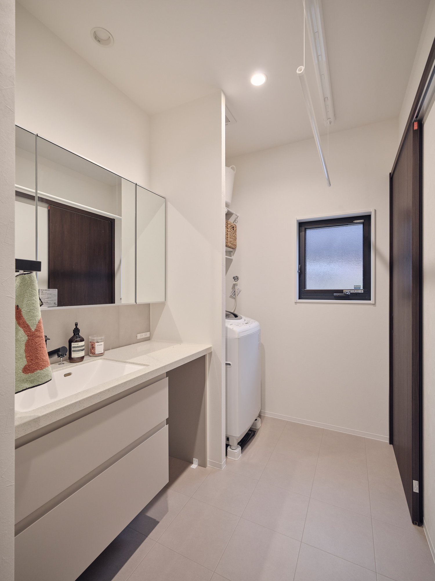 洗濯の「洗う・干す・しまう」を完結させる効率的な動線を構築しました。お子様がいるご家庭において、日々の洗濯は大きな負担となります。これらを極限まで短縮することで、育児や家事に追われる時間を「家族で笑い合う時間」へと変えるよう設計。今の利便性はもちろん、将来の暮らしやすさまでを見据えた、ひのき住宅ならではの機能美を追求しました。