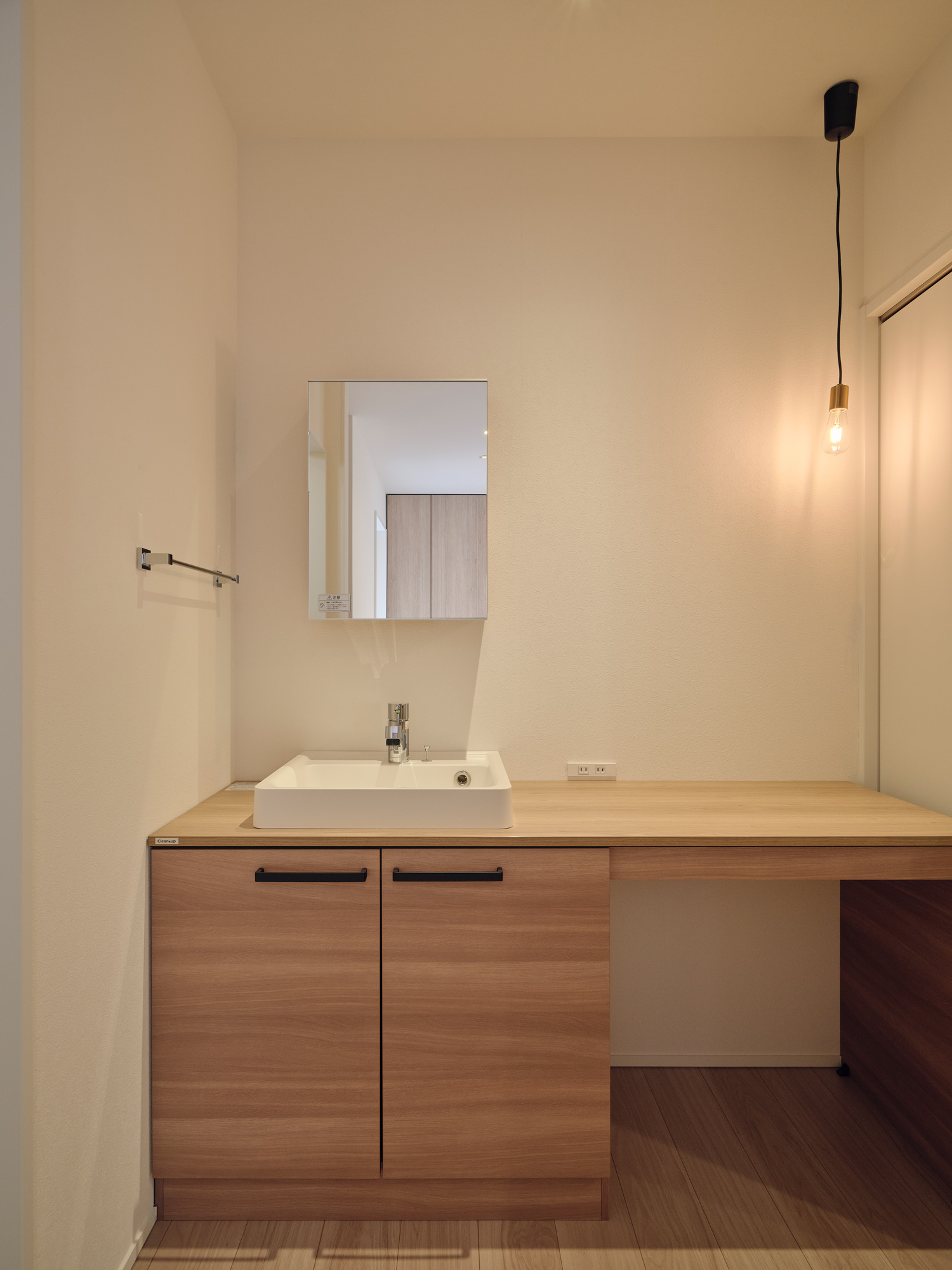 玄関から洗面スペースまでを一直線で結ぶ「ただいま動線」を構築しました。帰宅して靴を脱ぎ、そのまま迷わず手洗いへと向かえるこの配置は、お子様にとっても手洗いの習慣化を自然に促す健康的な設計です。