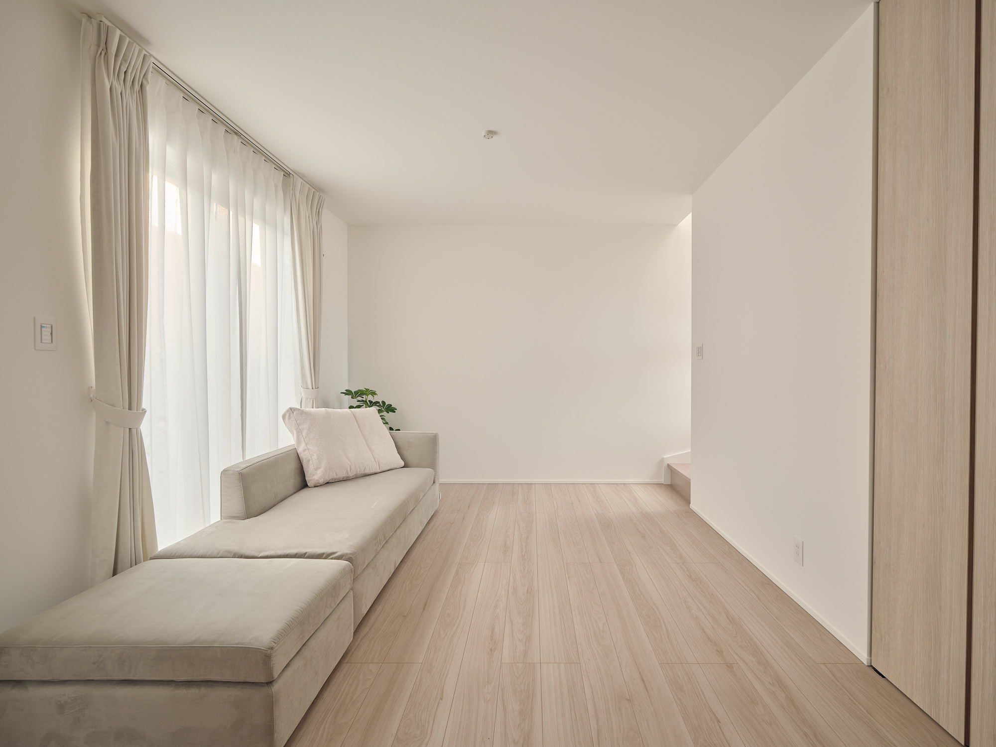 リビングの壁面をあえて装飾せず、大画面を映し出すための「投影スペース」として設計。映画鑑賞時には本格的なホームシアターに、普段は視線が奥へと抜ける開放的な壁面として、一つの空間に二つの役割を持たせています。