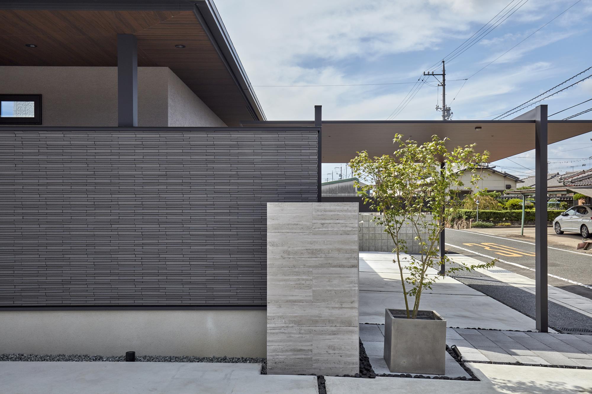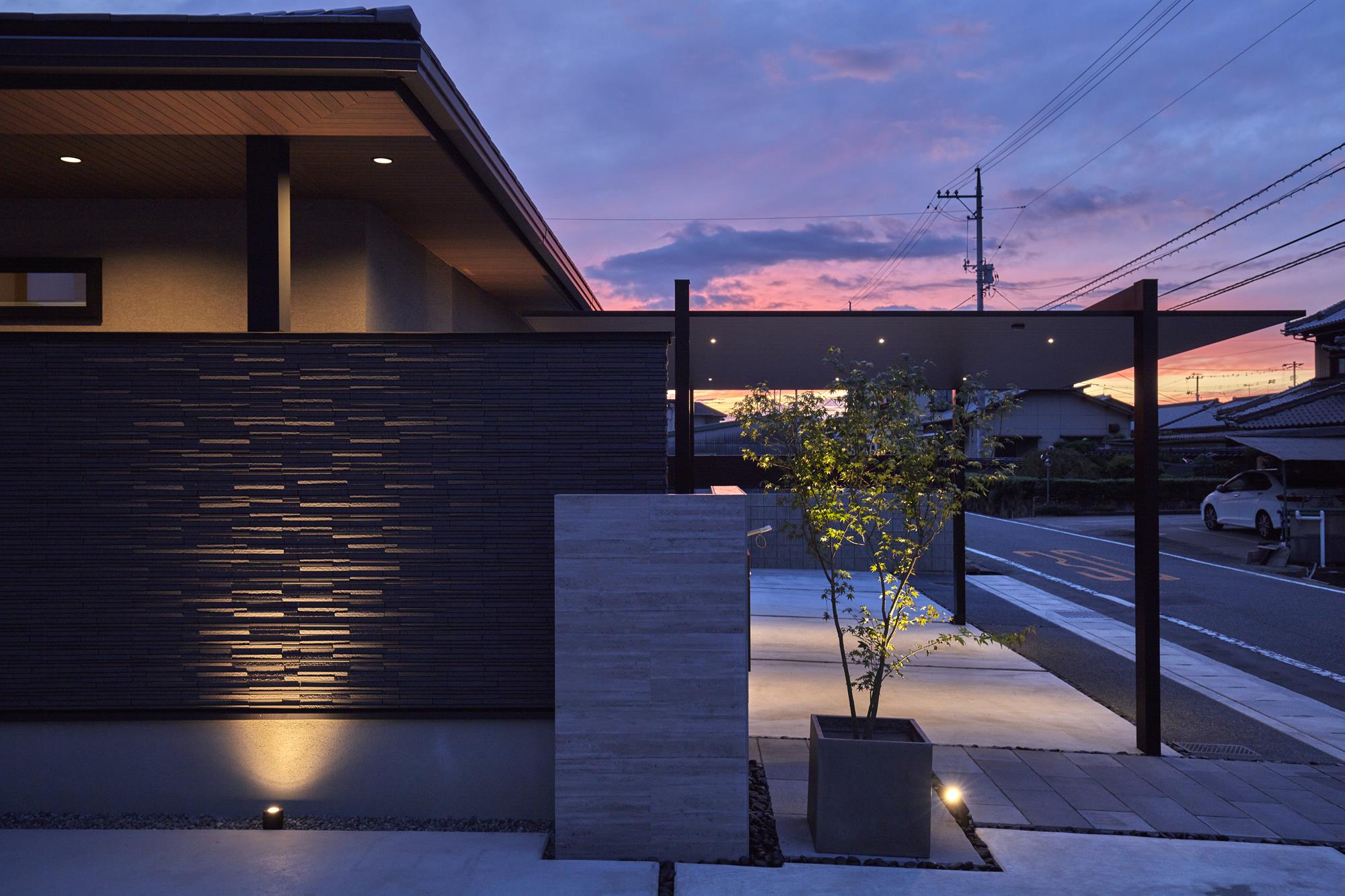 家の第一印象を決める玄関前には、あえて表面に凹凸のある壁タイルを採用しました。太陽の光や夜の照明が当たることで、タイルの陰影がドラマチックに変化し、外観に深い表情を与えます。また、外構の植栽を照らすライトアップ計画により、植物のシルエットとタイルの質感が調和。帰宅するたびに、その美しさに目を奪われるような情緒豊かなアプローチをしつらえました。
