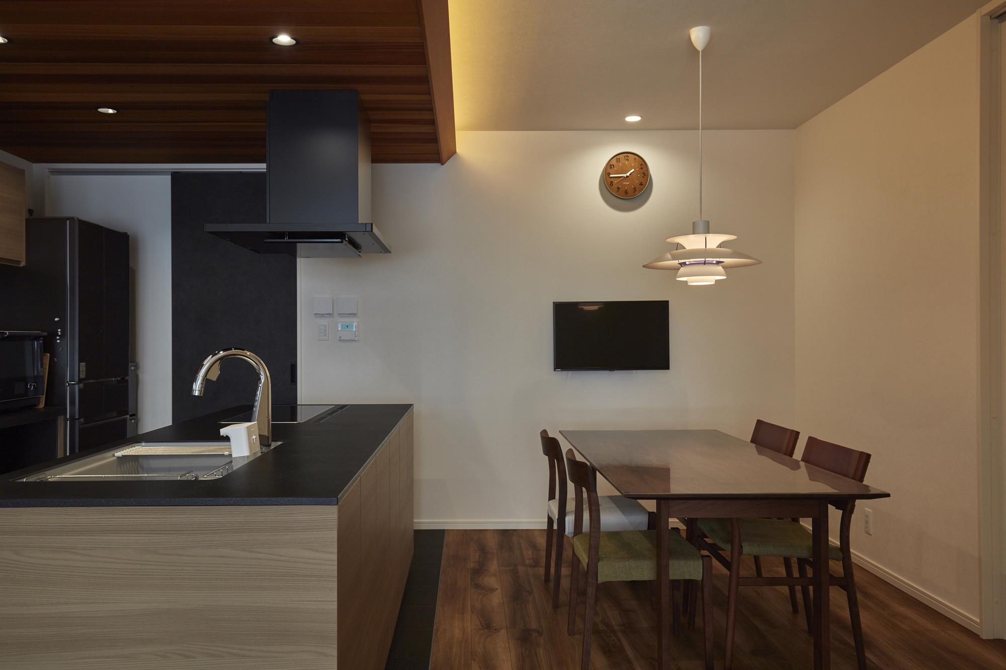 LDKの主役となるキッチンエリアには、レッドシダー材の「下がり天井」を設けています。キッチン全体を温かみのある木目で統一することで、機能的な場所に「家具のような落ち着き」を持たせました。