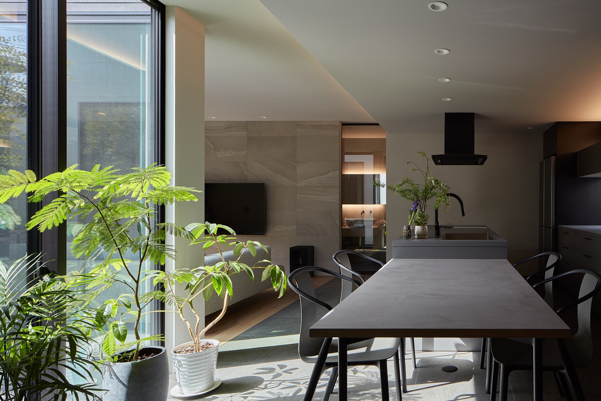 ダイニングテーブルはモルタル調で仕上げ、さまざまな素材を組み合わせた空間です。