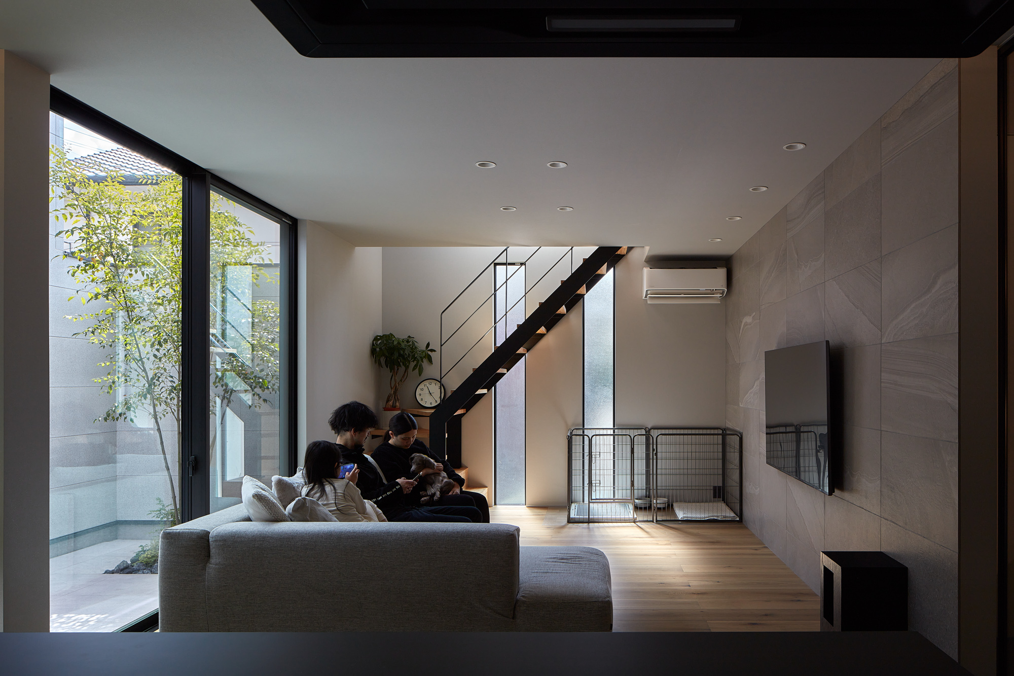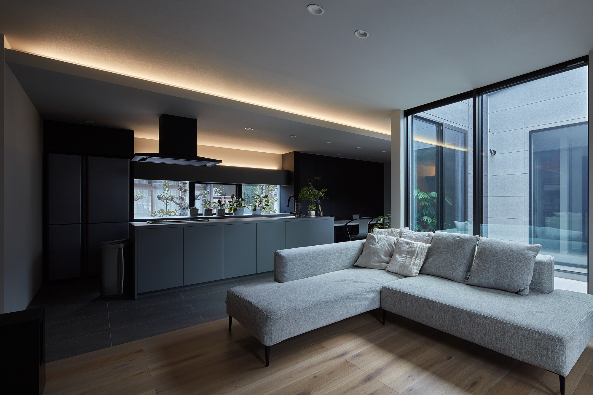 LDKとつながる中庭を設けることで、室内と外がゆるやかにつながる開放的な空間に。視線が外へ広がり、空間に伸びやかさを生み出します。