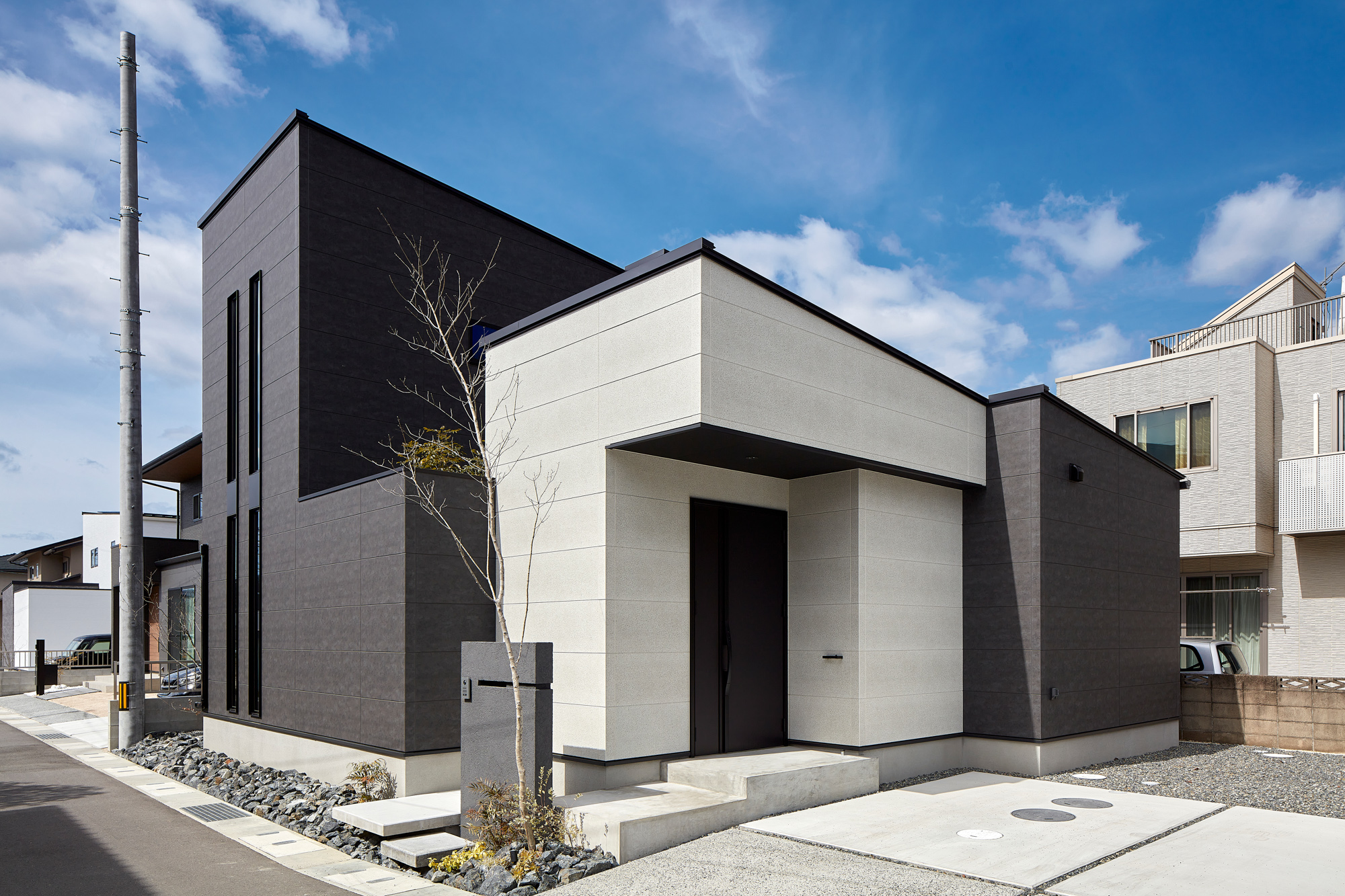 ブラックとホワイトのコントラストでまとめた、シンプルながら印象的な外観。左右非対称の凹凸をつくることで、立体感のある表情を生み出しています。