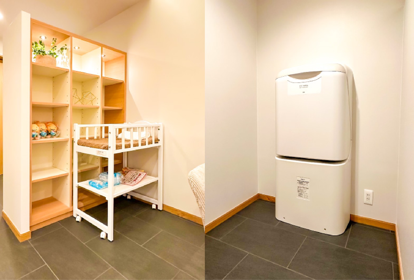 キッズスペース・ベビーベッド・おむつ交換台など、お子さまと一緒でも安心な設備完備。