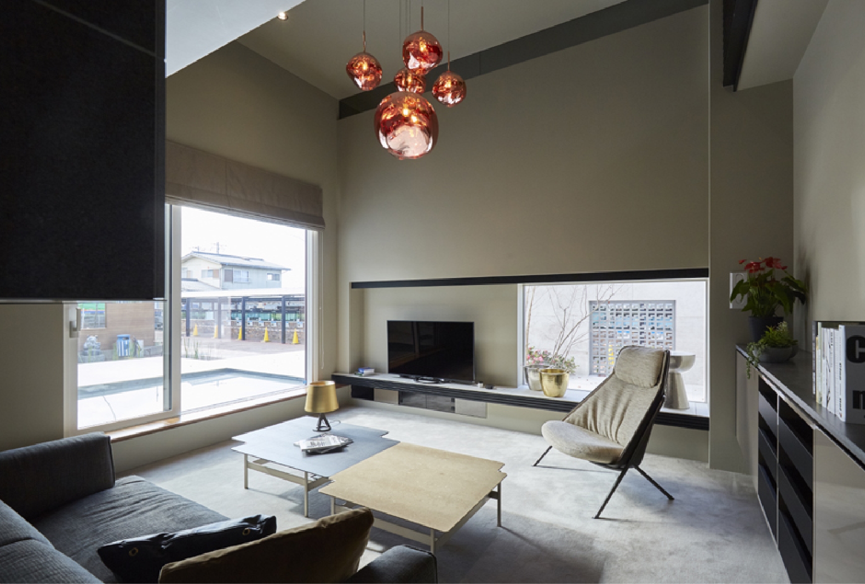 縦に広がる「吹き抜け」と大開口の窓はゆとりある生活を演出する。大小サイズの違った照明とバイオエタノールの暖炉はこだわりのインテリアコーディネート。