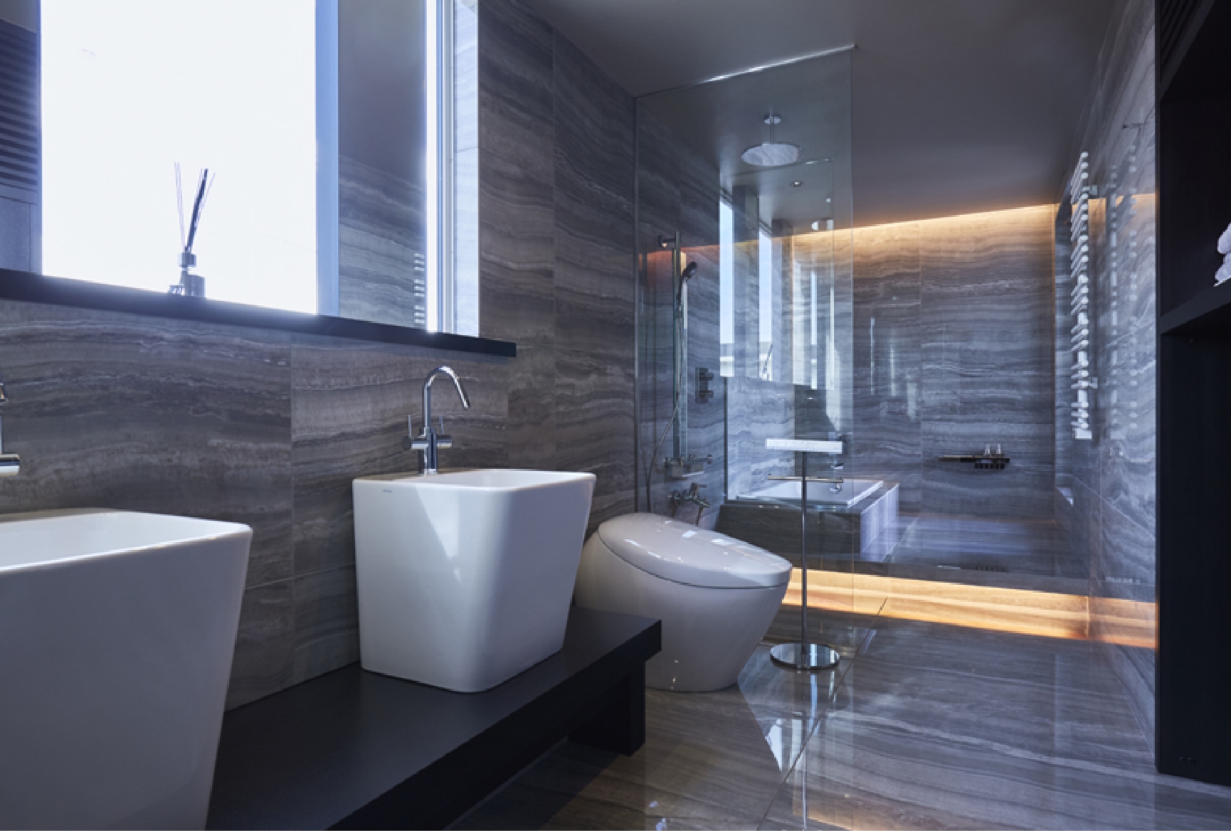 トイレやバスルームなどの水回り設備には最新のものを導入。ショールームとしても体感できます。