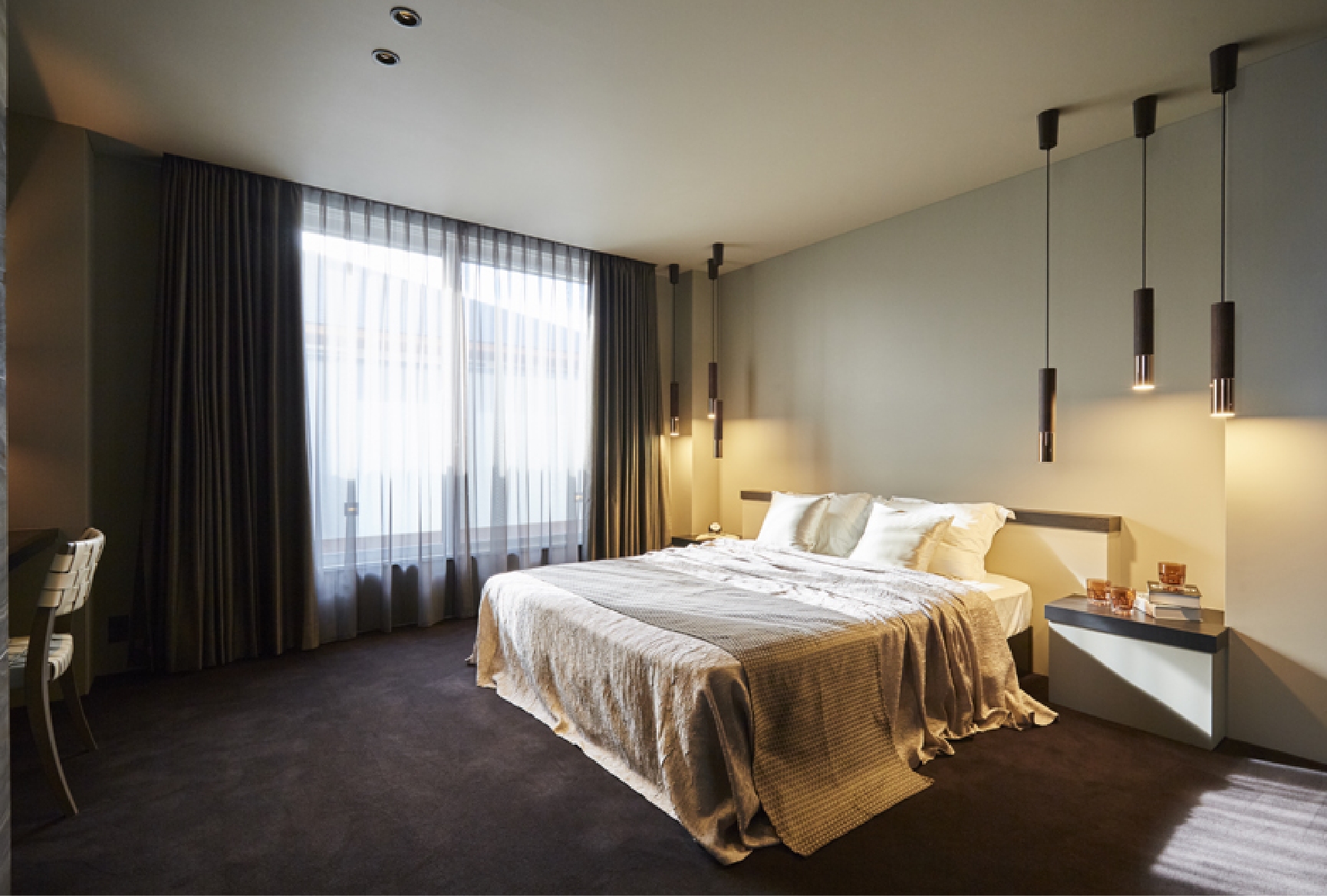 快適で上質な暮らしを寝室にも。まるでホテルに来たような空間に、見せる収納を体現するガラス張りのドレスルーム。